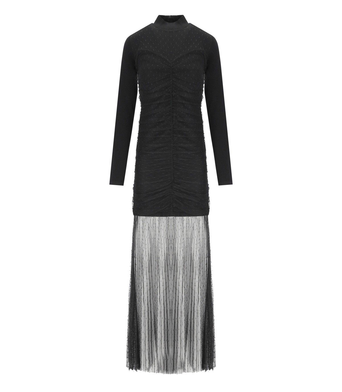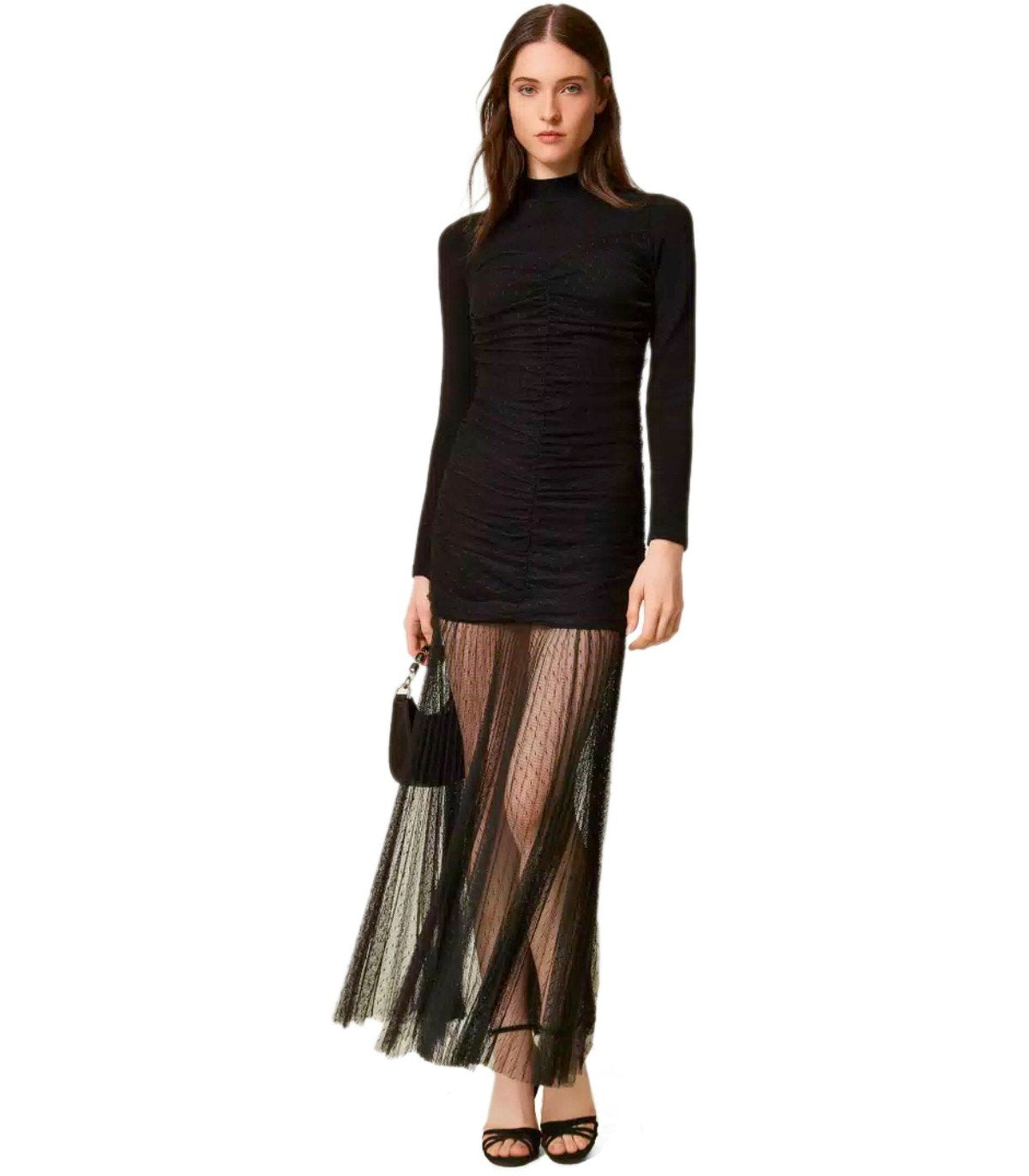 Twinset dress made from a viscose blend with black plumetis overlay. Features a back zip closure and a mock neck. Jewel logo on the back. Slim fit.