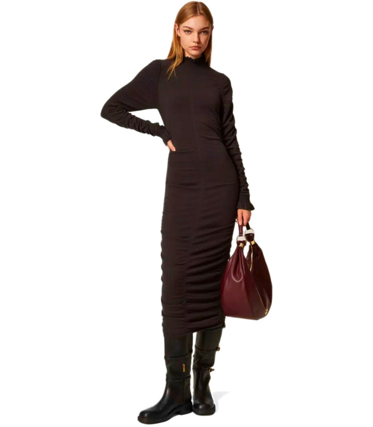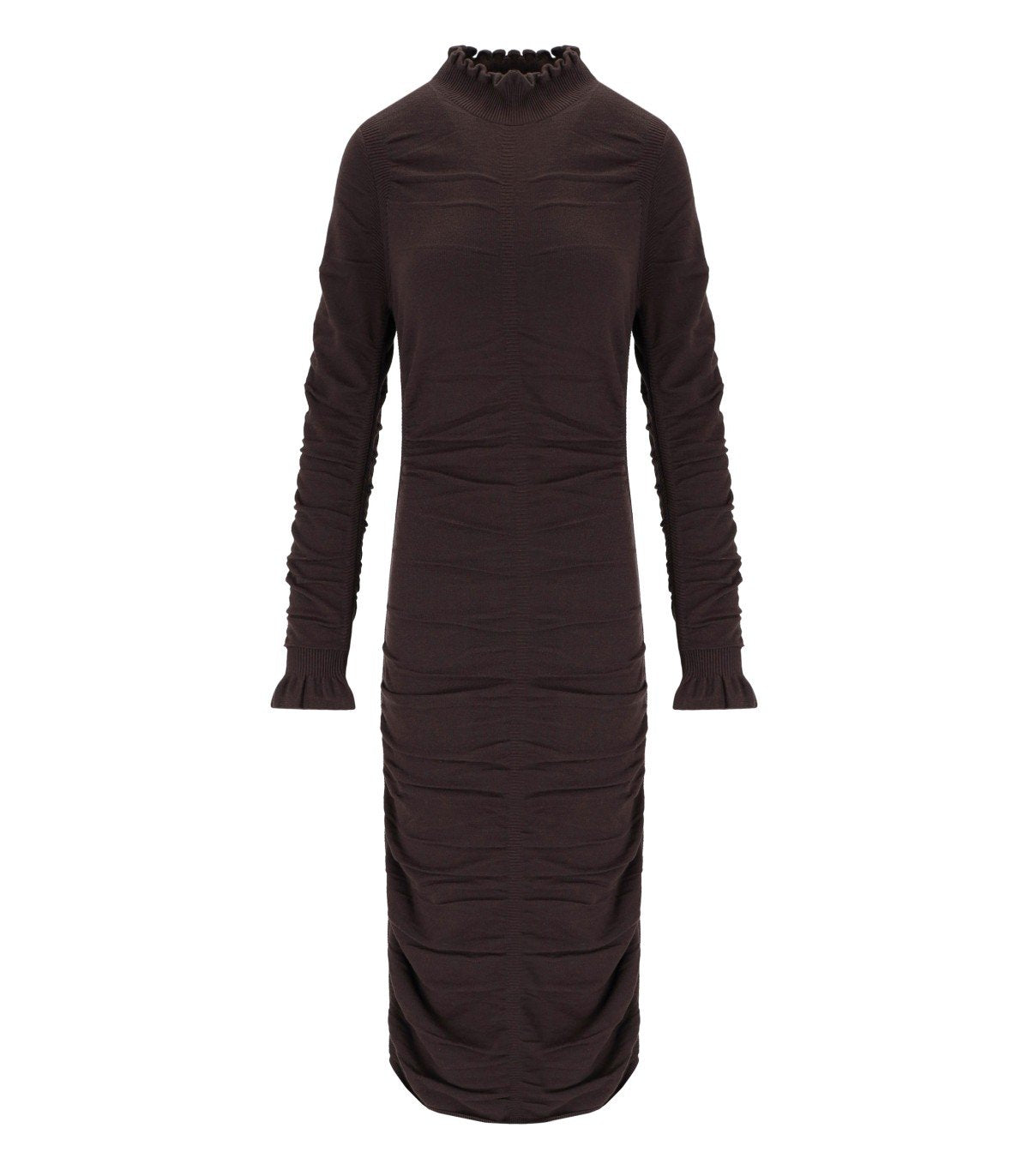 Twinset dress made from stretch viscose blend in shades of brown with gathered details. High neck, jeweled logo on the back, and flared sleeves. Slim fit.
