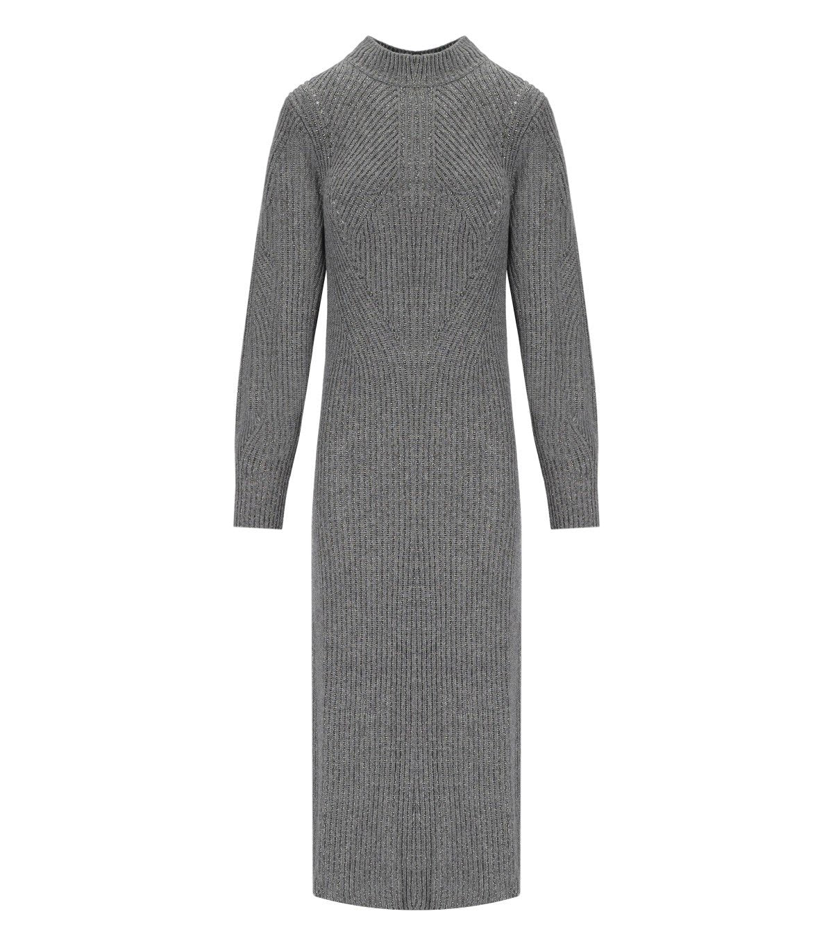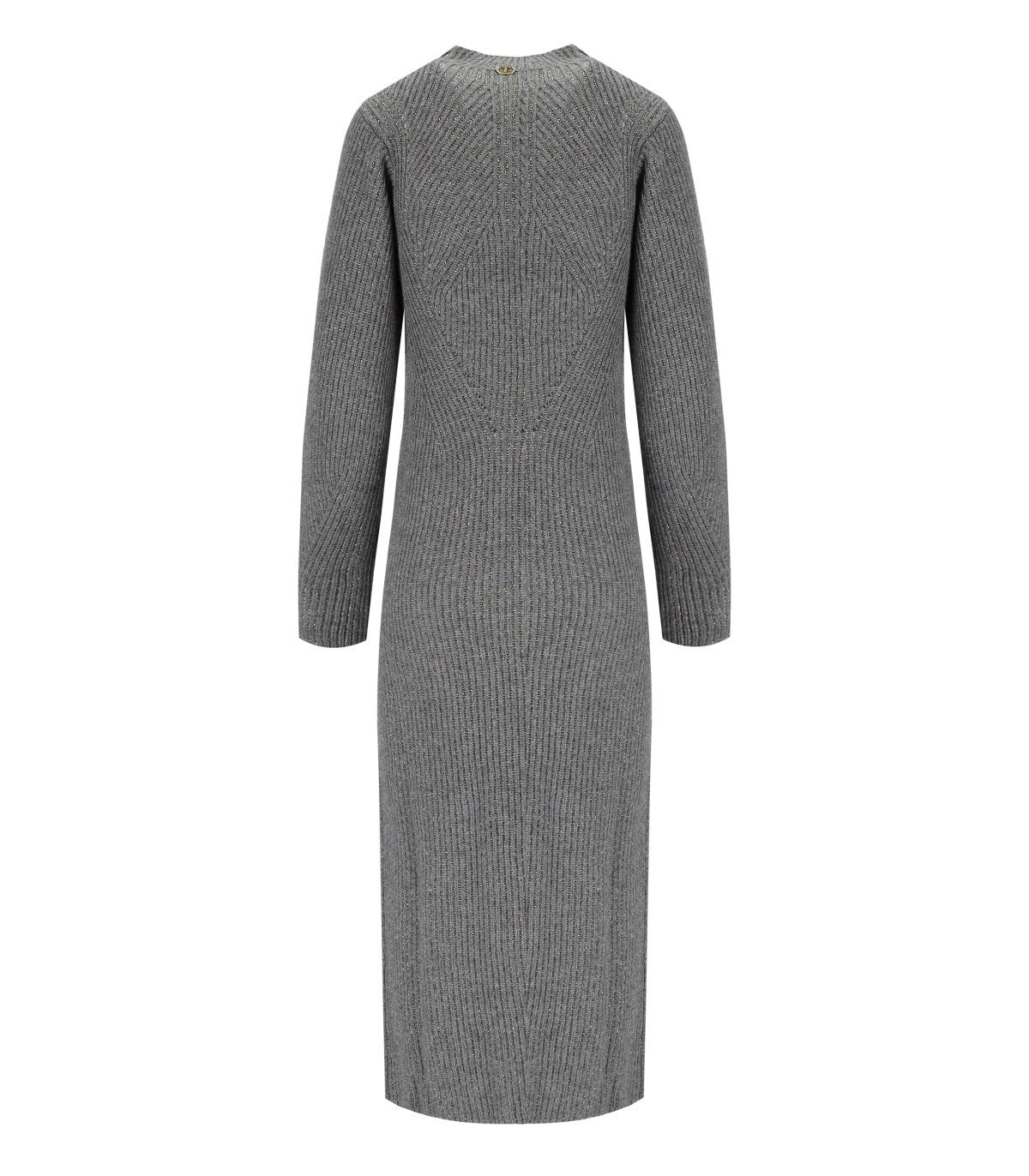 Twinset knit dress made from a viscose and lurex blend in shades of grey. Features a ribbed collar and a jeweled logo on the back. Slim fit.