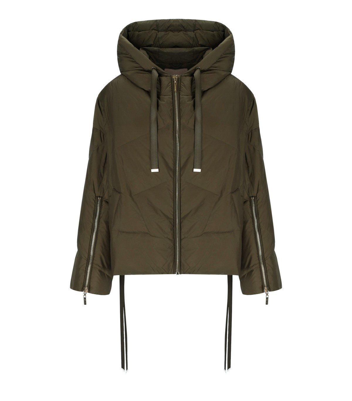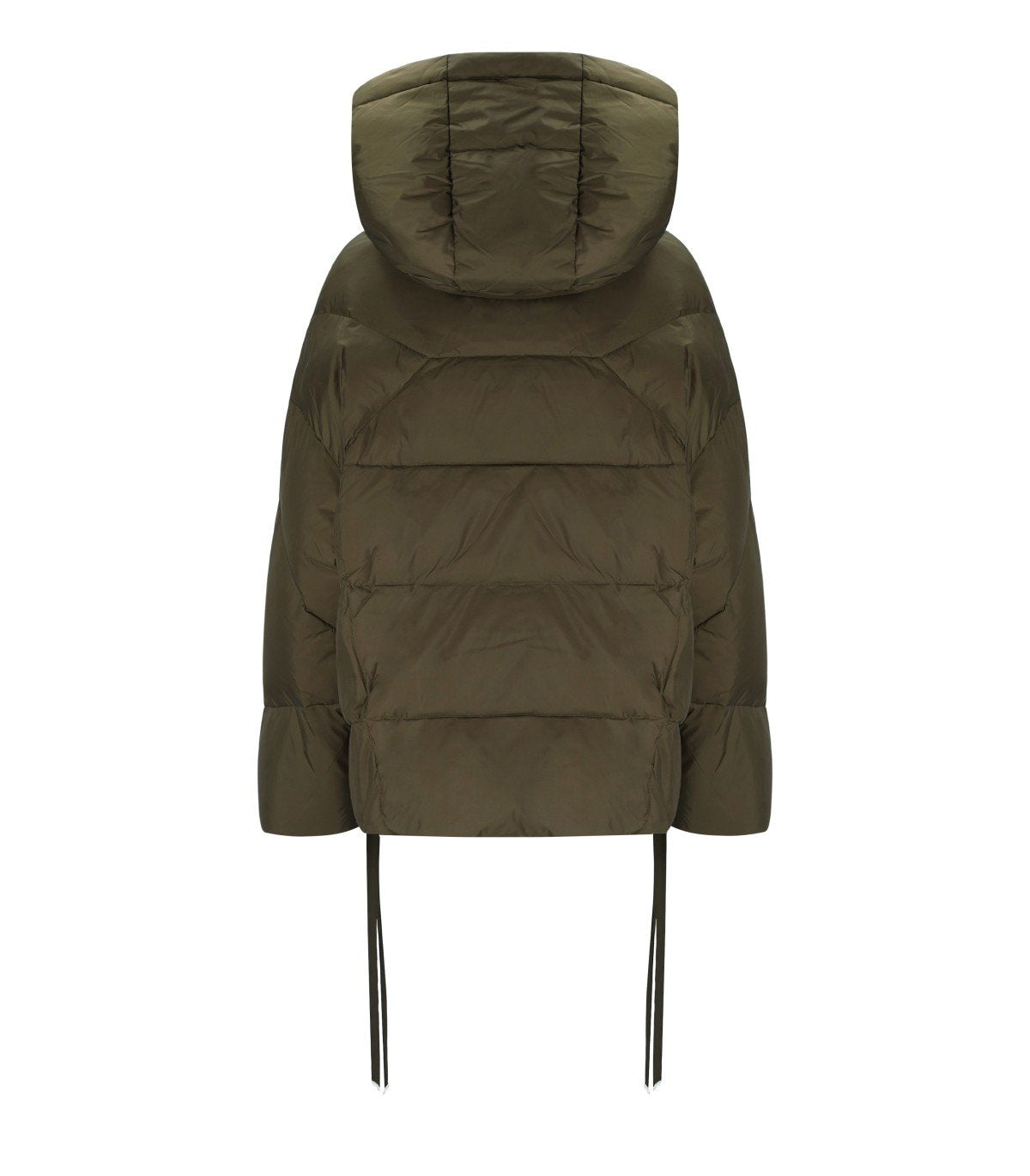 Twinset down jacket made of nylon with a quilted pattern in shades of green. Features a hood with drawstring and a branded zip closure at the front. Characterized by long ties at the hem and branded zips on the sleeves. Oversized fit.