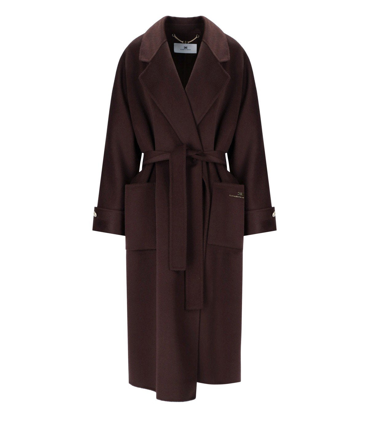 Abrigo de Elisabetta Franchi confeccionado en lana en tonos marrones. Presenta un amplio cuello con solapa y mangas largas con puños vueltos adornados con botones con el logo. Tiene dos bolsillos frontales, uno de ellos con el logo, y un cierre de cinturón que acentúa la cintura. Sin forro. Corte oversize.