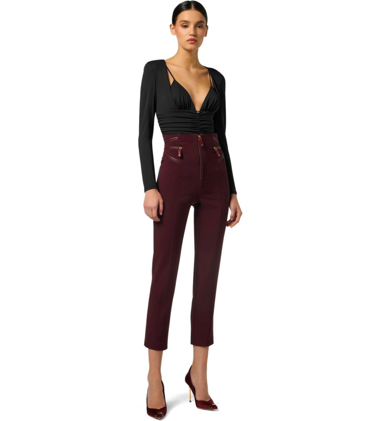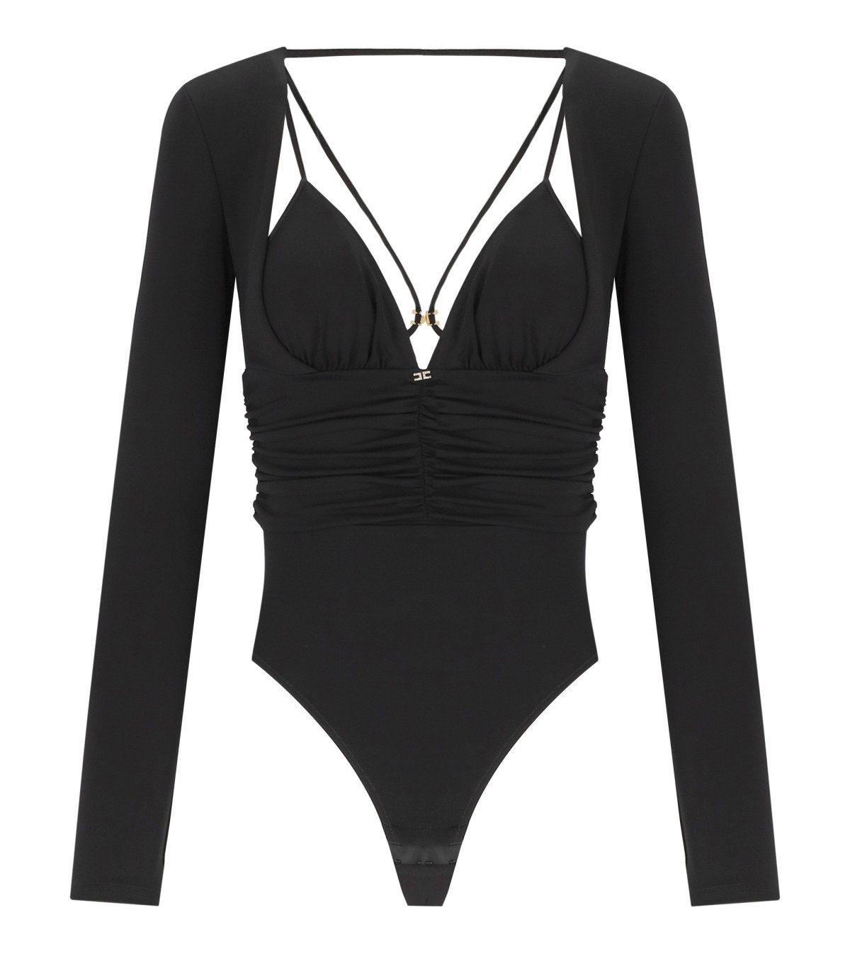 Body de Elisabetta Franchi confeccionado en jersey de viscosa negro. Presenta un escote amplio y una espalda semiabierta con detalle de logo dorado. Parte inferior estilo brasileño con cierres. Corte ajustado.