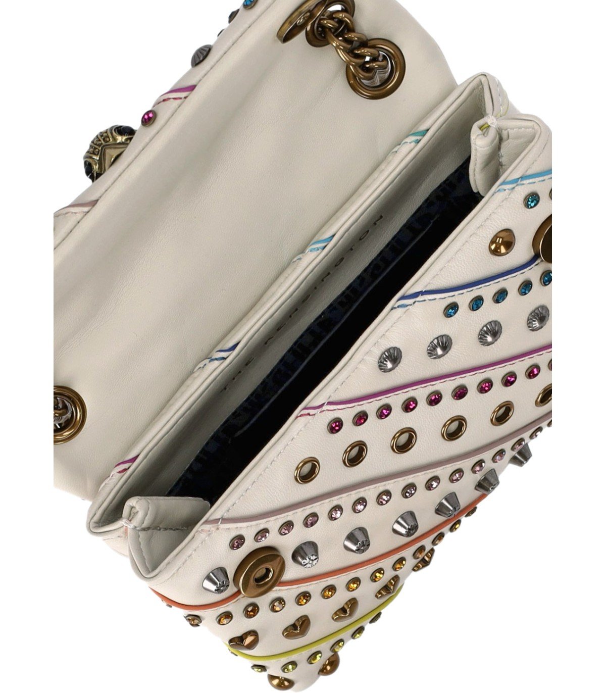 Bolso de hombro Kensington hecho de cuero en tonos blanco crema, adornado con detalles, tachuelas y pedrería multicolor dispuesta en diagonal. Forrado, cuenta con un compartimento interno. Equipado con una correa de cadena deslizante que permite llevar el accesorio al hombro o cruzado. Cierre con botón magnético. Dimensiones: 20,5x14x6 cm.