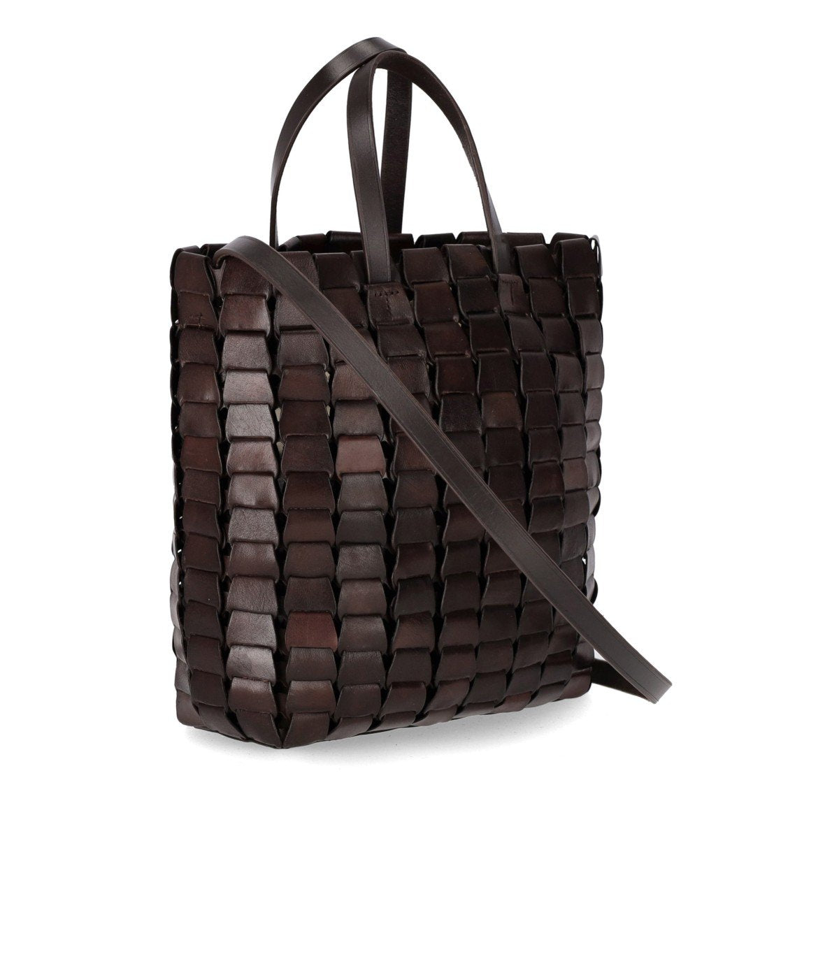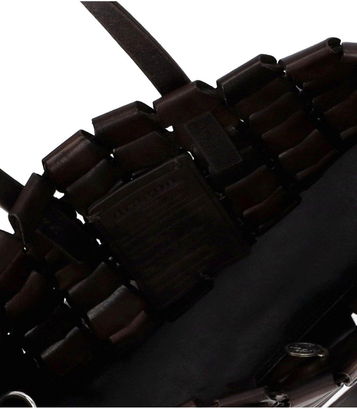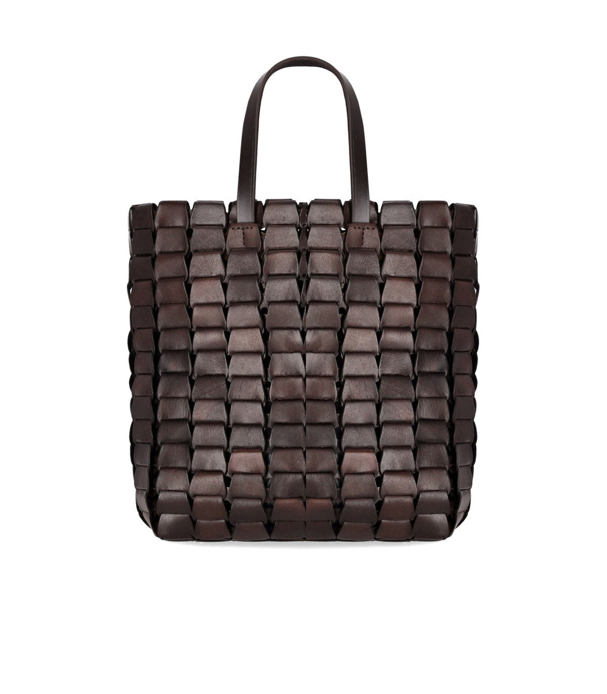 Bolso tote Dragon Diffusion Link confeccionado en piel trenzada de trama ancha en tonos marrón oscuro. Presenta doble asa en piel lisa. Incluye correa de piel para llevar al hombro o cruzado. Etiqueta interior de piel con la marca. Medidas: 31 x 10 x 29 cm.