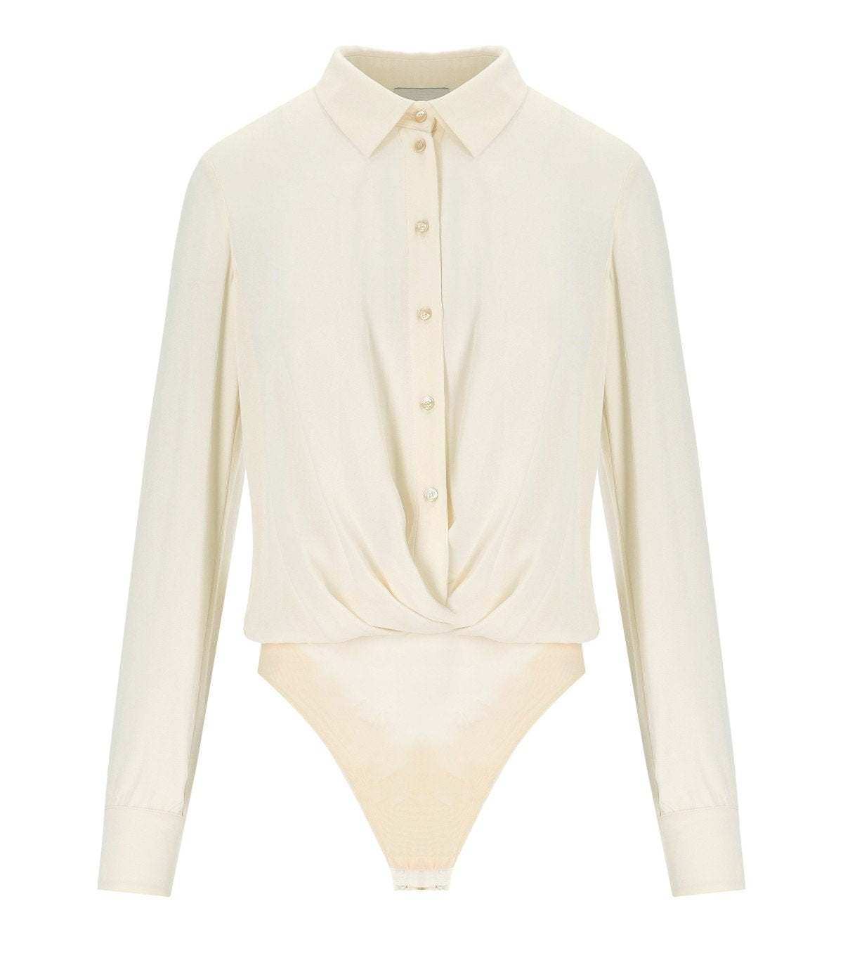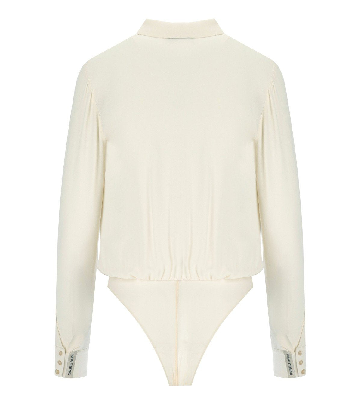 Body-camisa de Elisabetta Franchi confeccionado en georgette en tono blanco leche. Caracterizado por cuello tipo camisa y mangas largas con puños personalizados con cinta con logo. Embellecido con un drapeado cruzado en la parte delantera. Presenta cierre con botones en la parte frontal. Braguita tipo brasileña con cierre de corchetes. Ajuste slim.