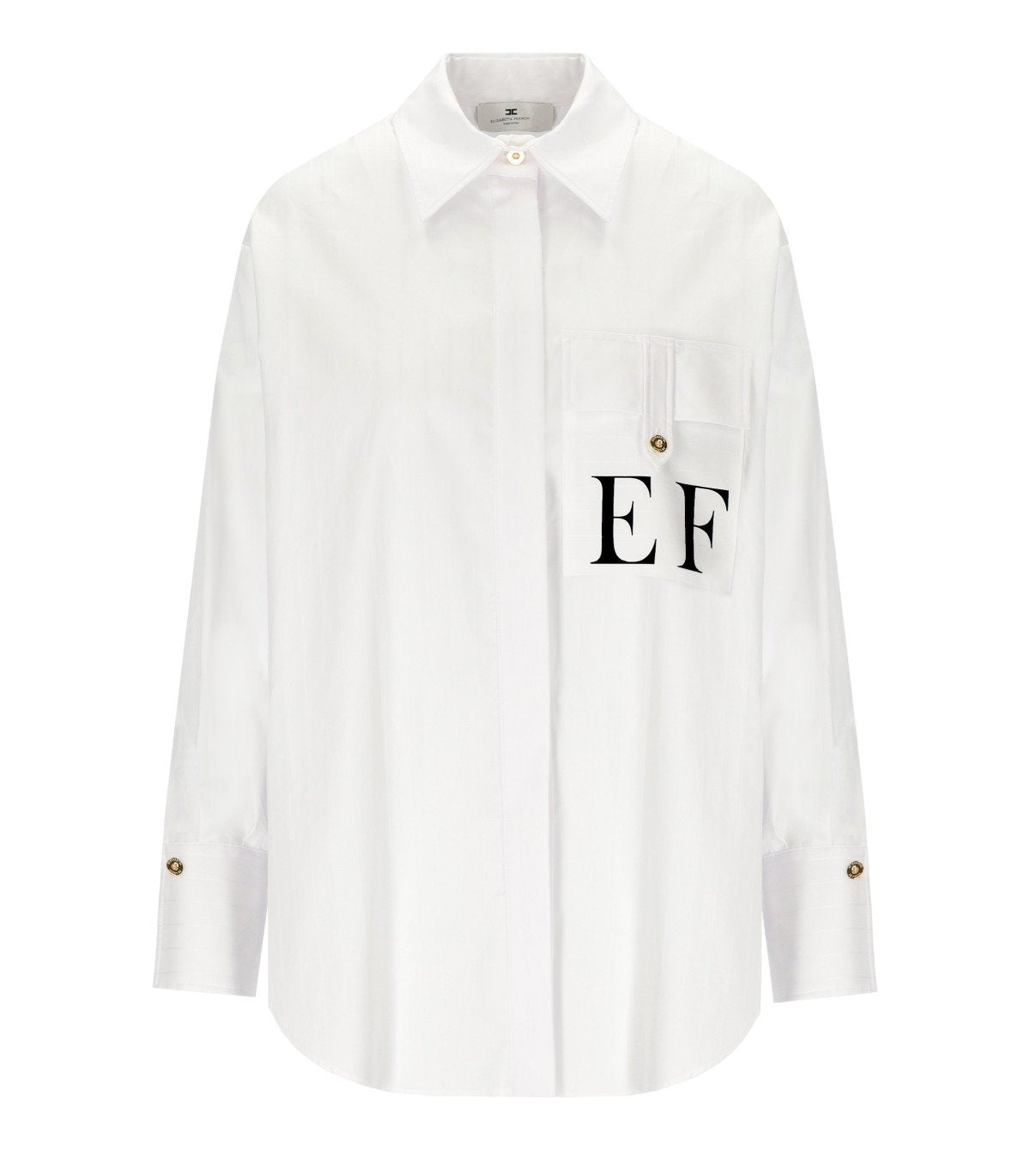 Camisa Elisabetta Franchi confeccionada en popelina de algodón blanca. Bolsillo en el pecho con maxi logo EF en contraste, corte asimétrico ligeramente más largo en la parte trasera.