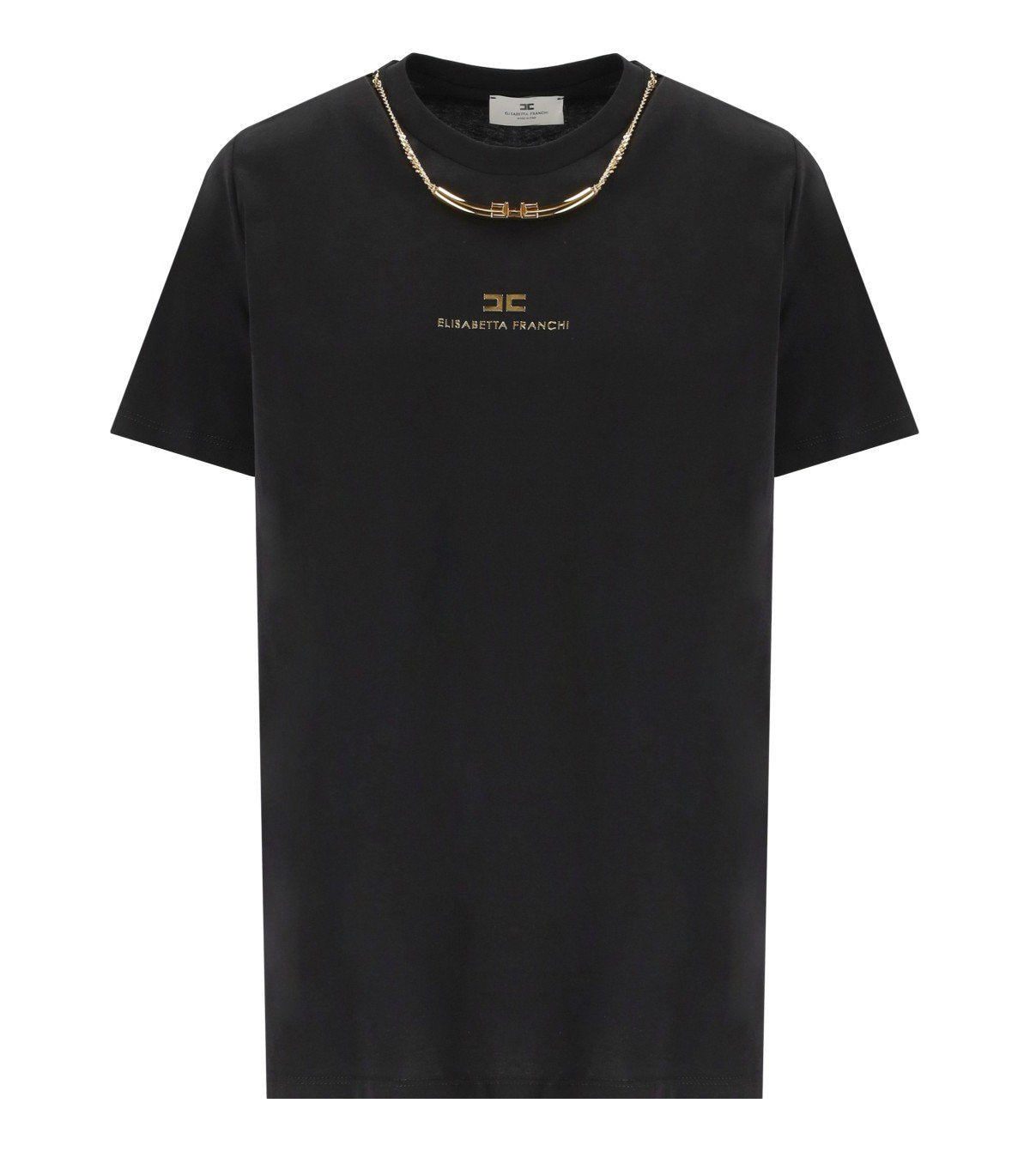Camiseta Elisabetta Franchi confeccionada en algodón en tonos negros. Adornada con un collar extraíble de metal dorado con el logo de la marca. Logo en la parte delantera. Corte regular.