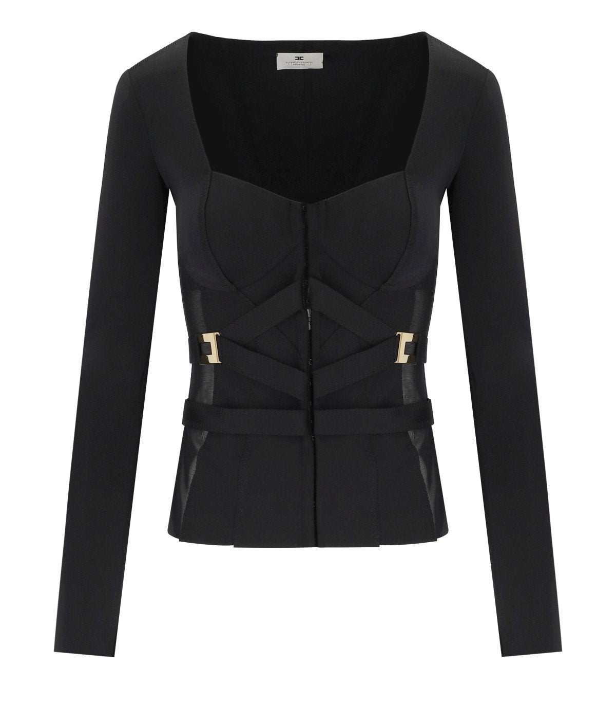 Blazer de Elisabetta Franchi confeccionado en crepé en tonos negros. Presenta una construcción tipo bustier, con inserciones de tul y un cinturón de cintura con logotipo que resalta la silueta. Cierre frontal con ganchos. Corte slim.
