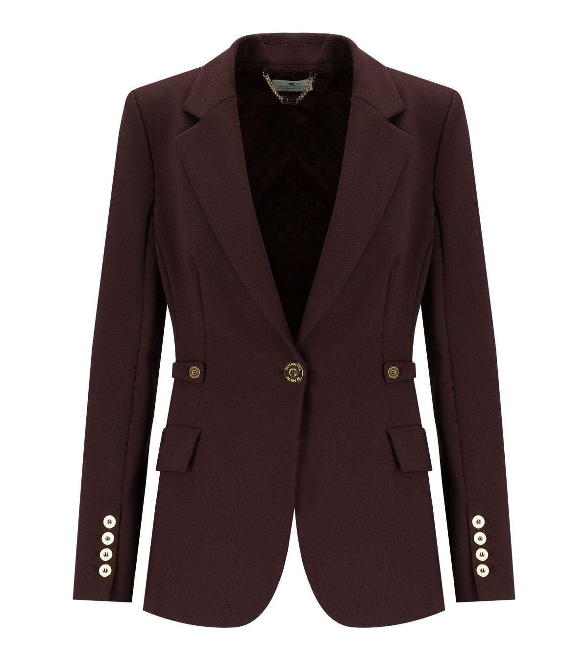 Blazer entallado de Elisabetta Franchi confeccionado en crepé burdeos. Presenta hombreras y forro interior, adornado con botones dorados. Cierre de un solo botón.
