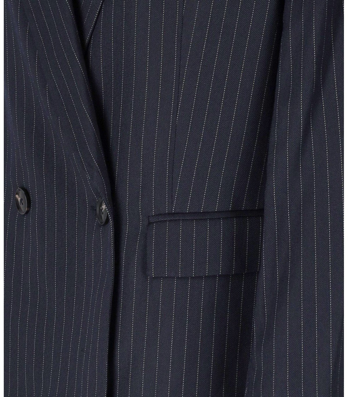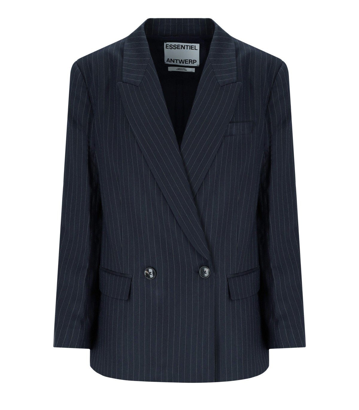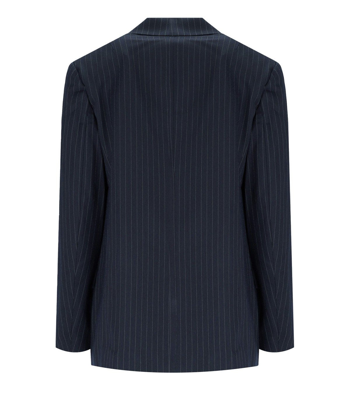 Blazer Ipursuit de Essentiel Antwerp confeccionado en una mezcla de viscosa azul marino con un diseño de rayas finas. Corte recto y oversize, interior forrado, hombros acolchados y mangas con cremalleras ocultas para ajustar el ajuste. Cierre de botones.