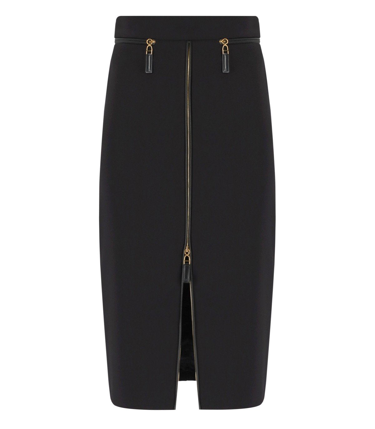 Falda de Elisabetta Franchi confeccionada en crepé negro, con aplicaciones de cremallera en contraste e inserciones en material efecto piel sintética. Forro de satén con monograma y cierre trasero oculto. Corte ajustado.