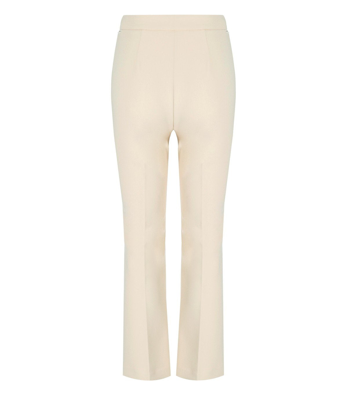 Pantalones Elisabetta Franchi confeccionados en crepé de un tono blanco lechoso. Presentan una raya planchada en la parte delantera, cierre de cremallera con botón dorado con la marca y cremalleras con inserciones de piel sintética en los laterales. Corte ajustado.
