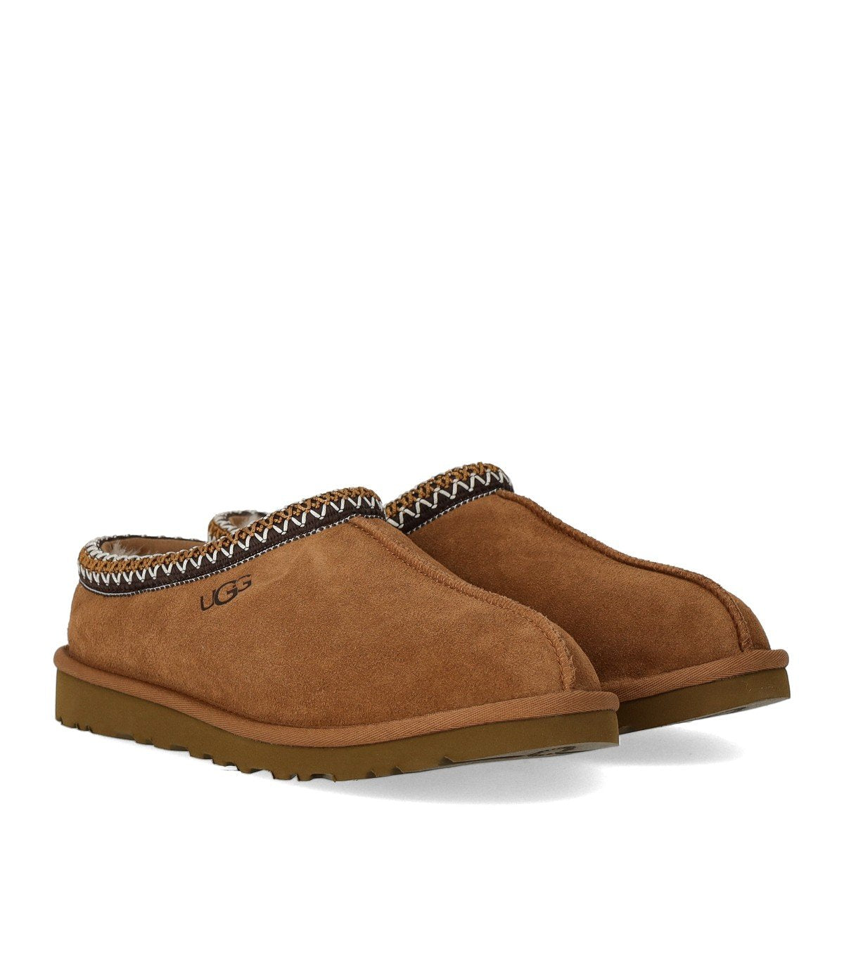 Zapatilla Tasman de Ugg hecha de cuero de ante en tono castaño. Presenta un ribete decorativo en el borde, forro e interior de lana de oveja. Suela de goma. Altura: 2 cm.