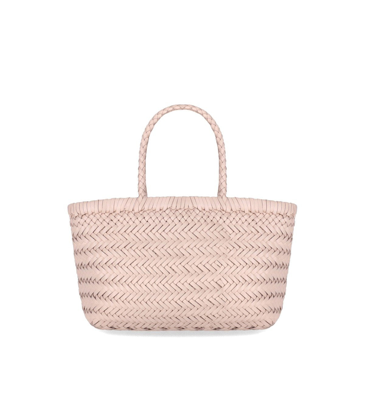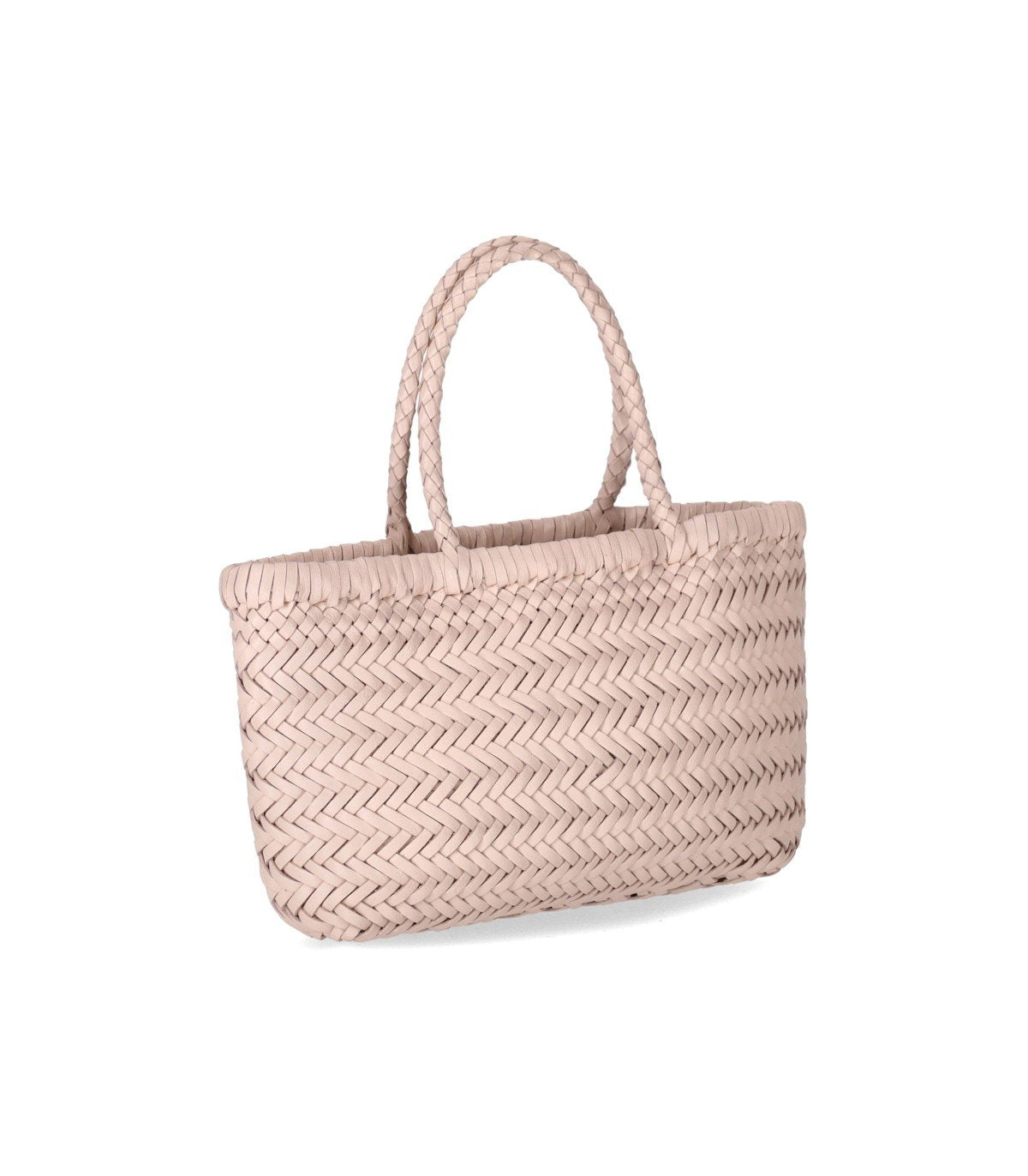 Sac Gora Dragon Diffusion en cuir, dans des tons rose poudré, avec un motif tressé en diagonale. Il est doté de deux anses. Étiquette intérieure en cuir avec logo. Dimensions : 23 x 17 x 6 cm.