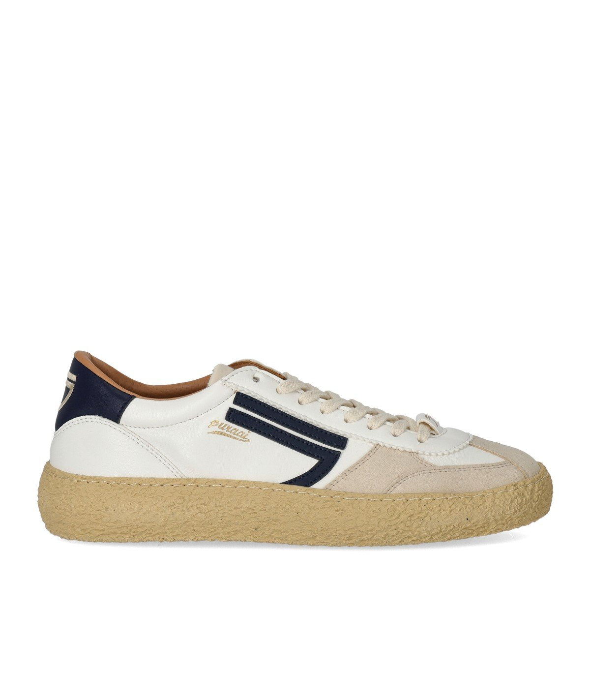 Baskets 1.01 Vintage Puraai confectionnées à partir de matériaux biologiques et recyclés. Elles présentent une tige dans des tons blanc et beige, avec des empiècements bleu foncé. Doublure en tissu éponge de coton et semelle intérieure amovible en liège. Semelle extérieure contrastée, hauteur de 4 cm. 100 % véganes.
