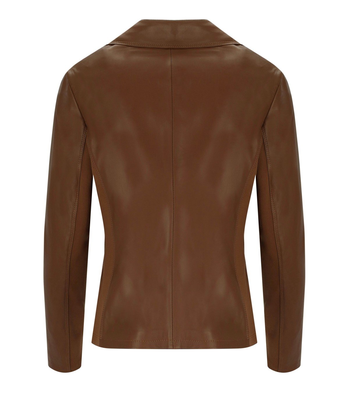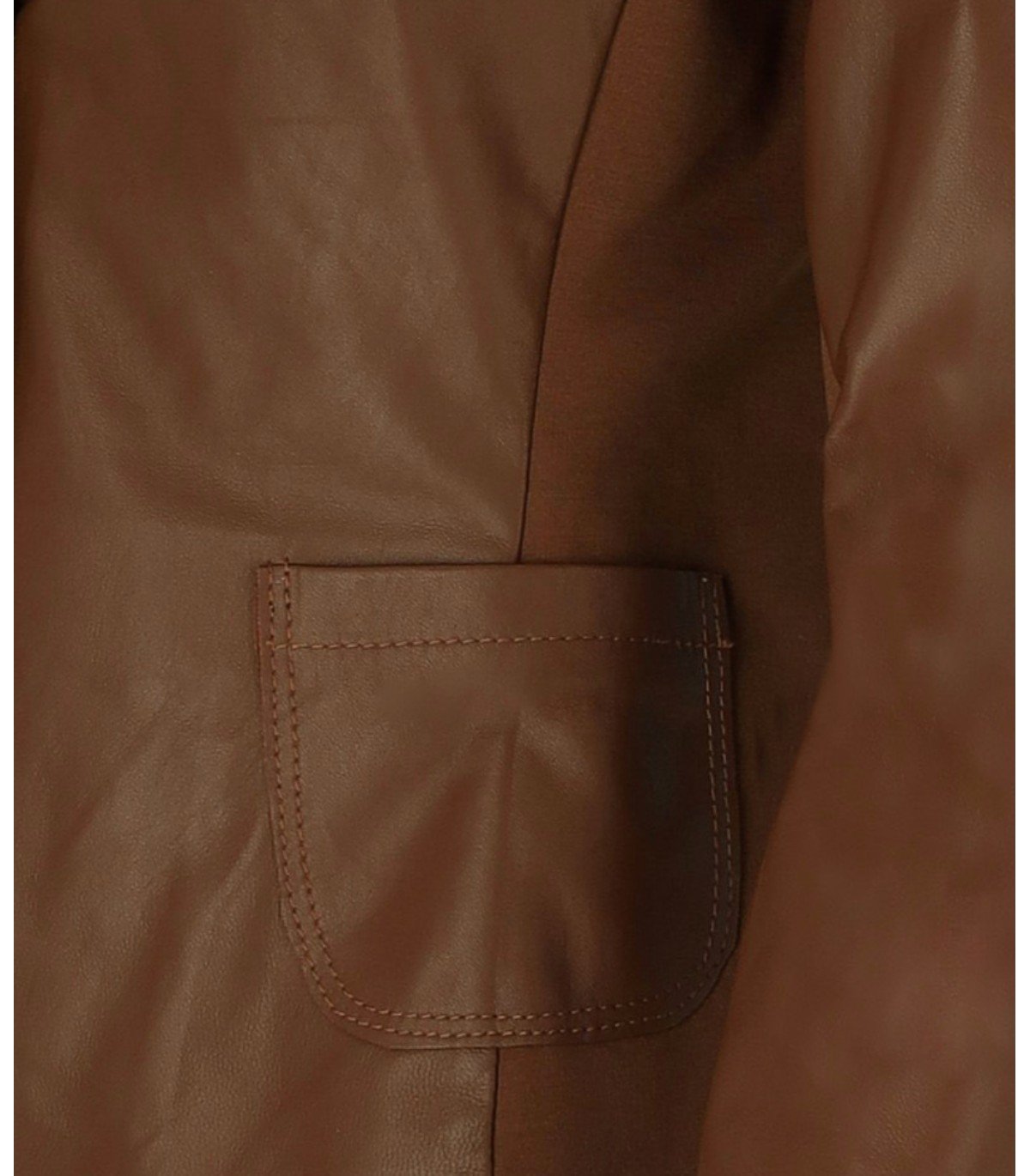 Blazer Myskin en cuir véritable avec empiècements en tissu stretch marron sur les côtés, col à revers et fermeture à un bouton. Doublure à motifs, coupe ajustée.