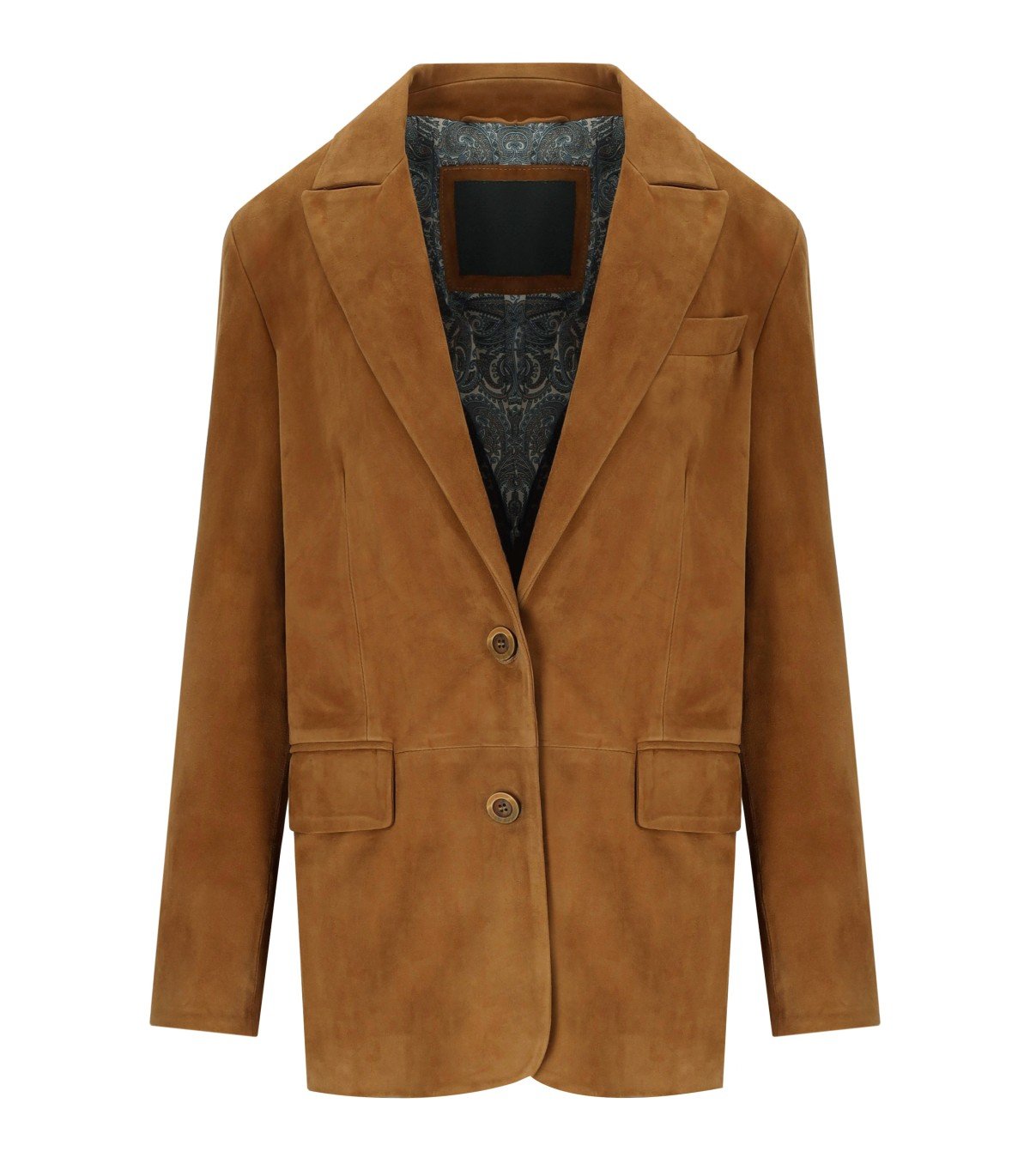 Blazer oversize Myskin en daim camel. Il présente une fente au dos, une doublure à motifs et une fermeture à un bouton.