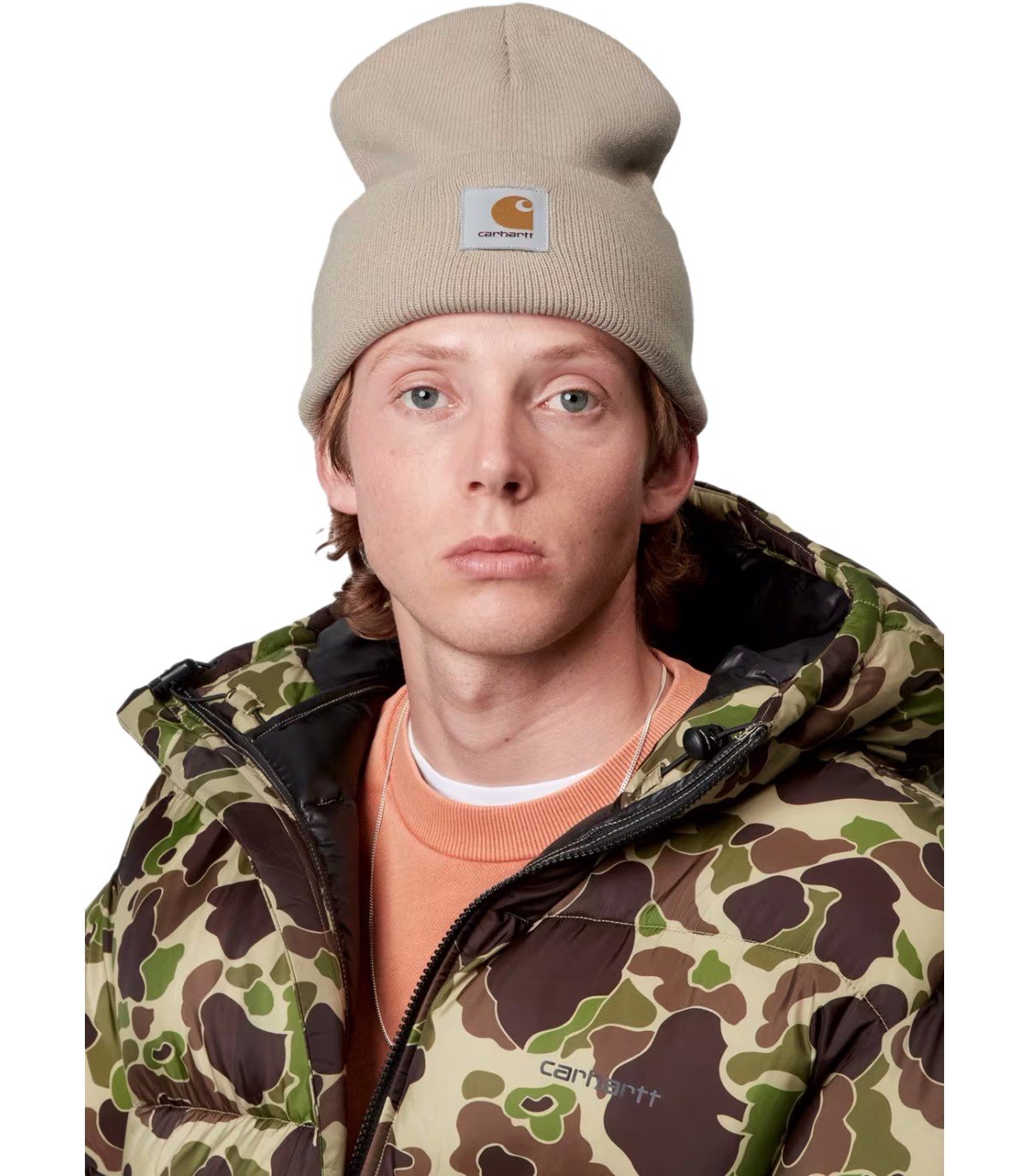 Bonnet beige Carhartt Wip en acrylique avec écusson logo sur le devant. Hauteur : 23,5 cm.