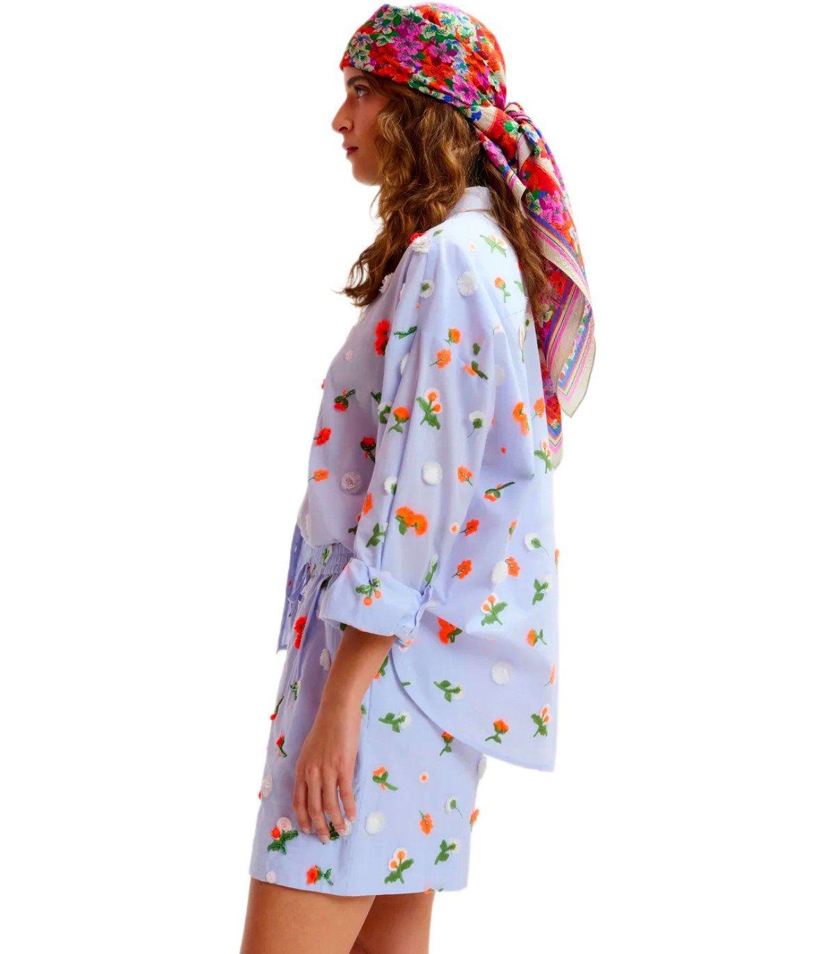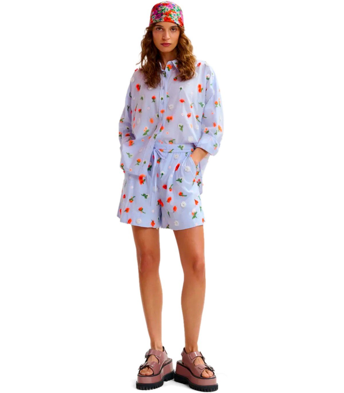 Short Jelena de Essentiel Antwerp en coton bleu, orné de motifs floraux rehaussés de sequins, strass et perles blanches, vertes et orange. Il présente une taille haute élastiquée, des poches latérales et une fermeture à cordon. Coupe décontractée.