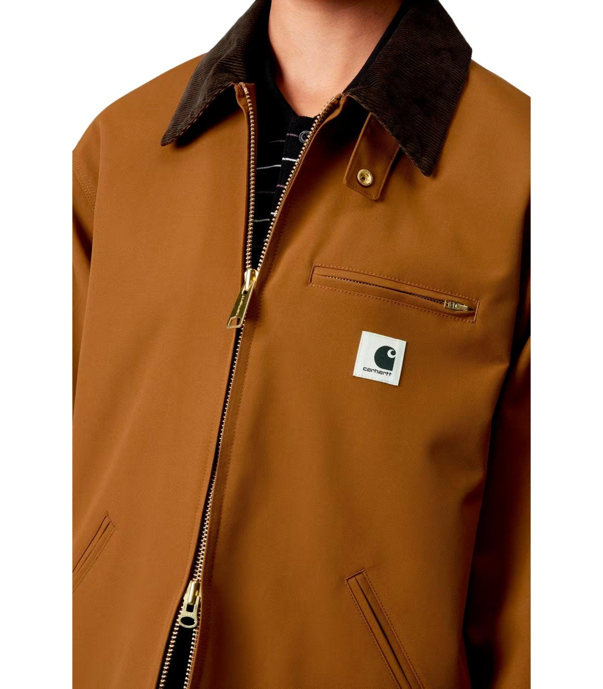 W' Clark Jacket di Carhartt Wip realizzata in nylon, impermeabile, nei toni del marrone con fodera in tessuto rete, dotata di coulisse sul fondo per regolare la vestibilità. Tasche frontali, iconico patch logo sul petto e colletto in corduroy marrone. Polsino regolabile con bottone. Chiusura con zip. Vestibilità regular.