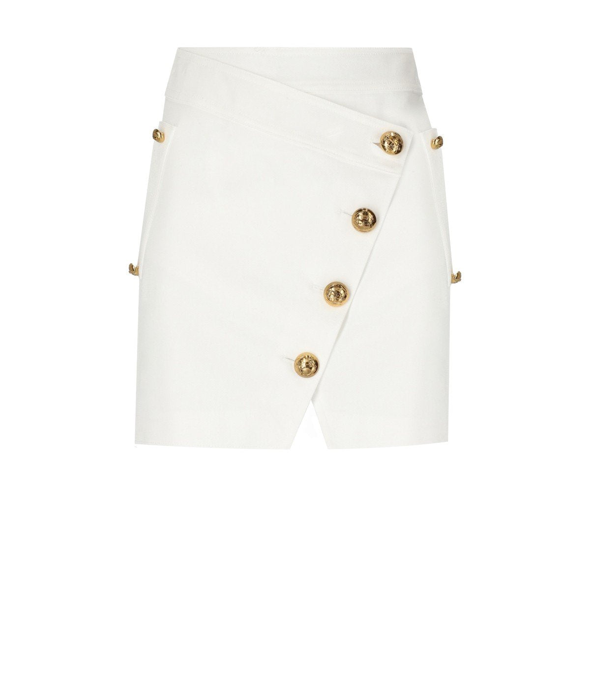 Gonna di Elisabetta Franchi realizzata in gabardina color avorio, caratterizzata da taglio asimmetrico sul davanti e maxi bottoni dorati. Interno foderato in raso con fantasia monogram.