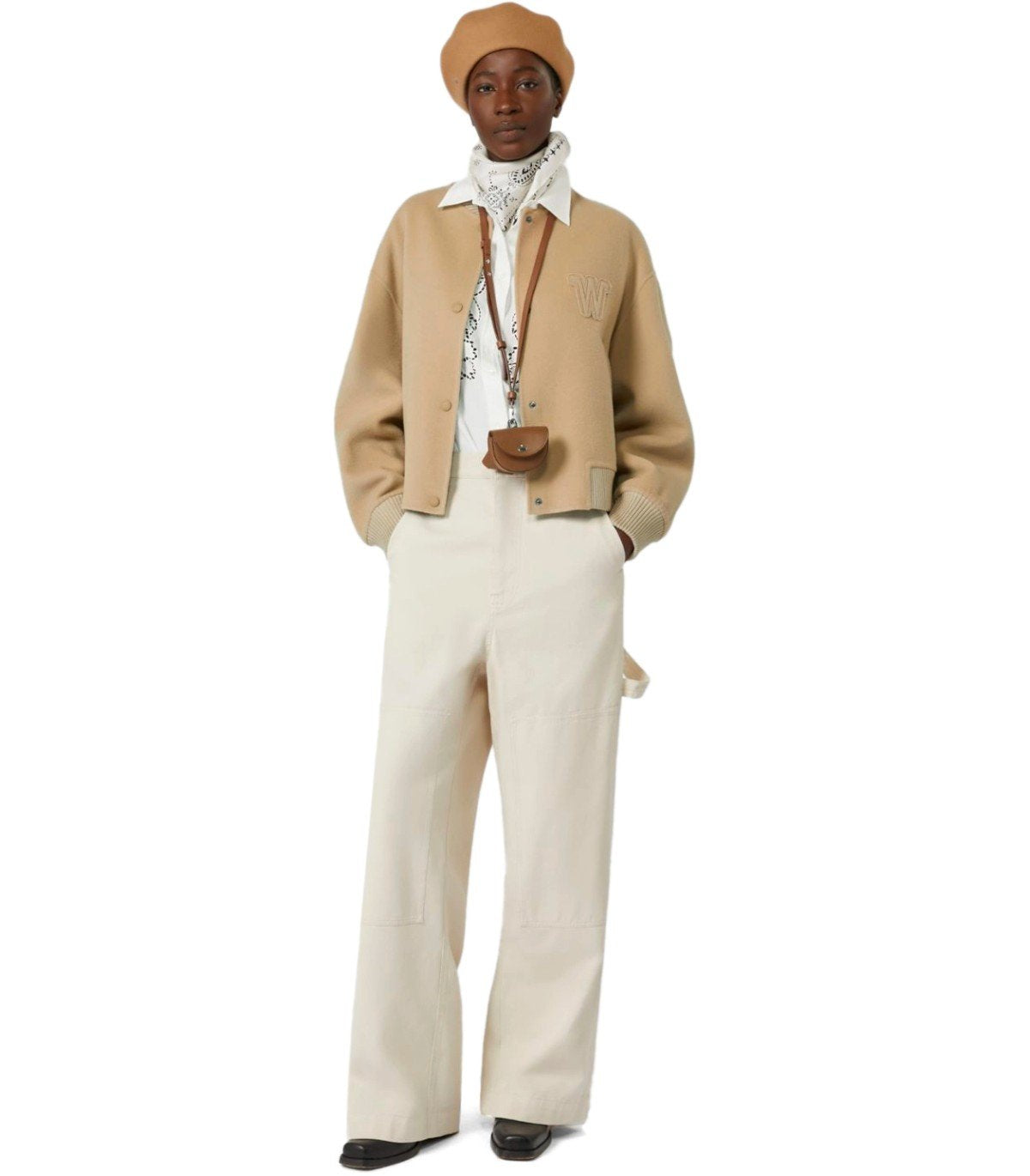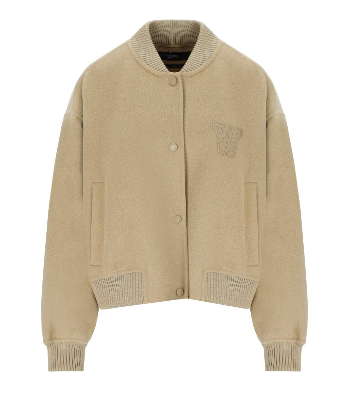 Bomber Zelante di Max Mara Weekend realizzato in tessuto di misto lana beige, sfoderato, rifinito con lavorazione a costine collo, polsini e orlo. Logo ricamato sul petto e tasche a filetto sul davanti. Chiusura con bottoni. Taglio corto con vestibilità leggermente oversize.
