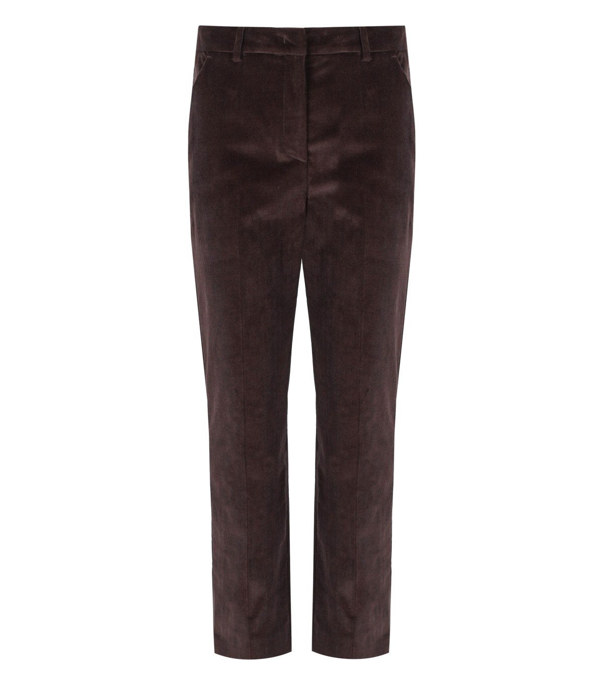 Pantalone Marruca di Max Mara Weekend realizzato in velluto di cotone a coste color vinaccia. Dotato di passanti per cintura, chiusura con zip e gancetto e tasche alla francese sui fianchi. Presenta tasche a doppio filetto con bottone sul retro, taglio cropped alla caviglia e piega stirata. Fondo svasato, slim fit.