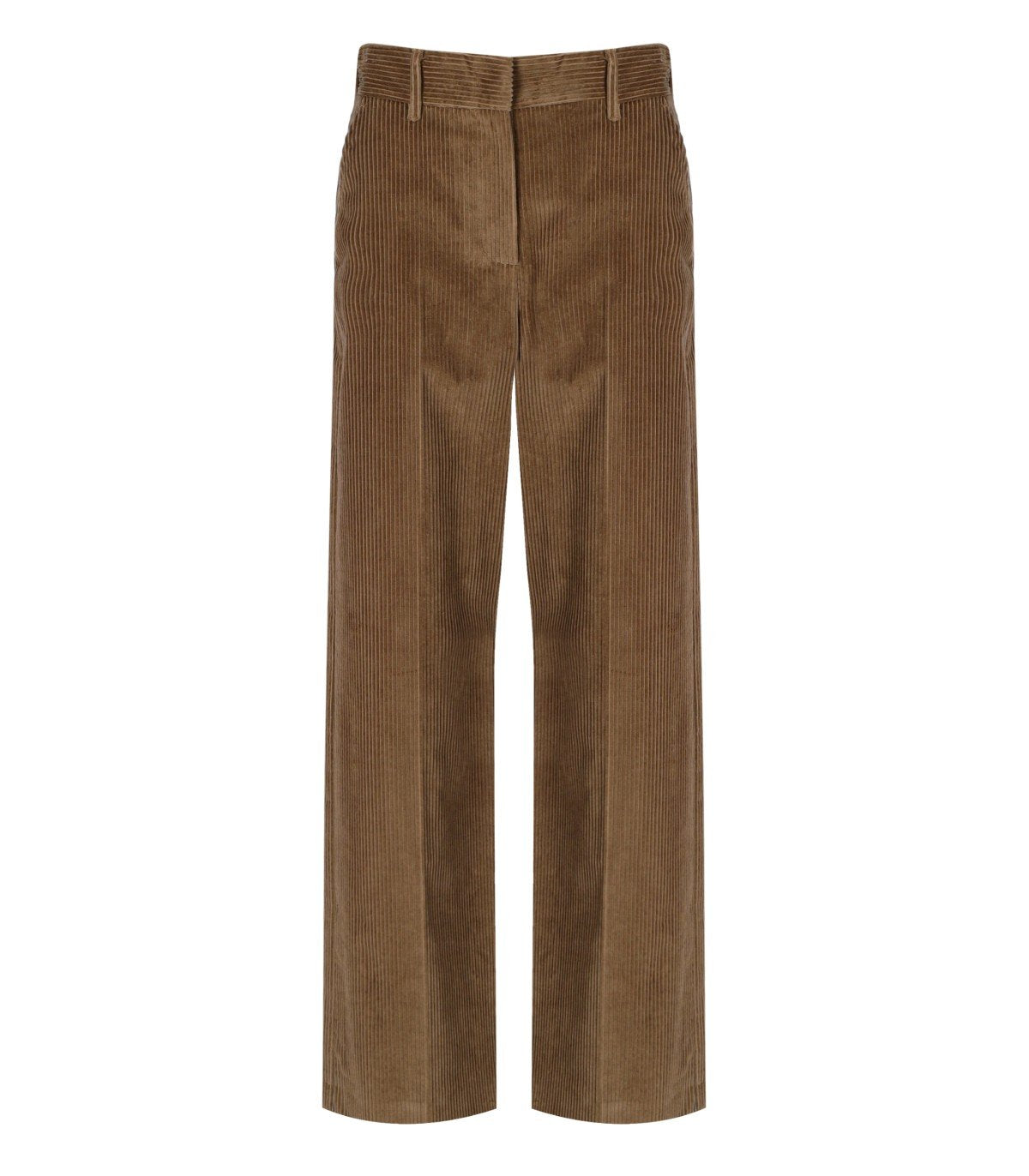 Pantalone Tania di Max Mara Weekend realizzato in velluto di puro cotone con motivo a coste nella tonalità nocciola. Presenta chiusura con zip e gancetto,tasche alla francese sui fianchi e tasche a filetto sul retro. Dotato di passanti per cintura. Piega stirata e gamba larga. Vestibilità morbida.