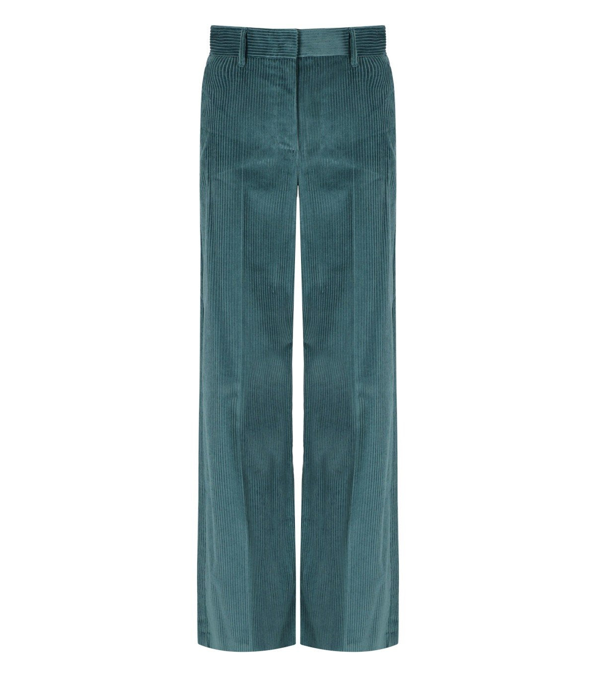 Pantalone Tania di Max Mara Weekend realizzato in velluto di puro cotone con motivo a coste nella tonalità verde petrolio. Presenta passanti per cintura e chiusura con zip e gancetto. Dotato di tasche alla francese sui fianchi, tasche a filetto sul retro e piega stirata. Caratterizzato da gamba larga. Vestibilità morbida.
