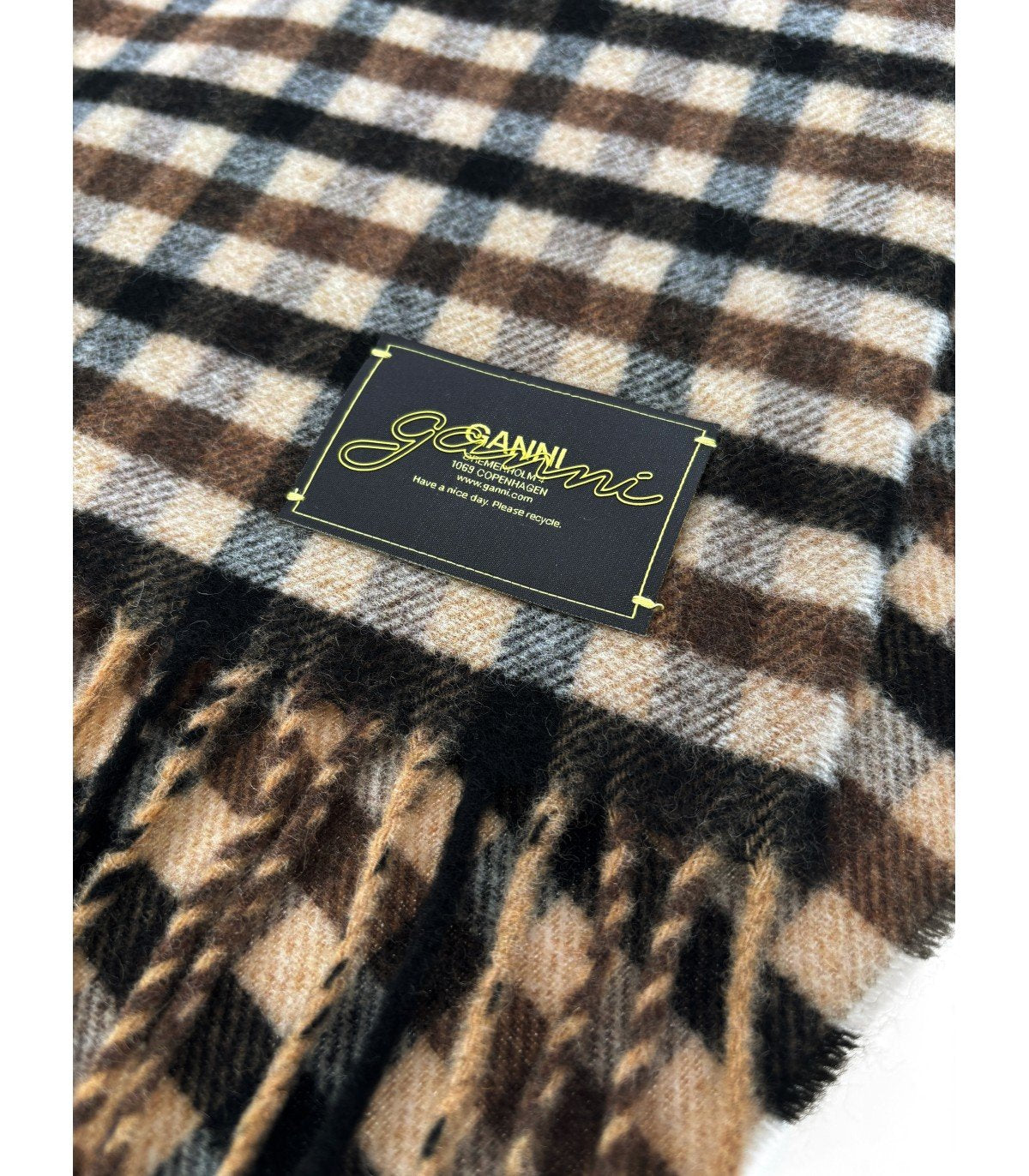Sciarpa di Ganni realizzata in lana con motivo a quadri in diverse tonalità di marrone. Presenta bordi sfrangiati e patch logo ricamato. Misure: 198x26 cm.