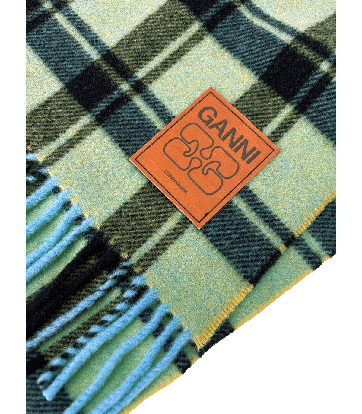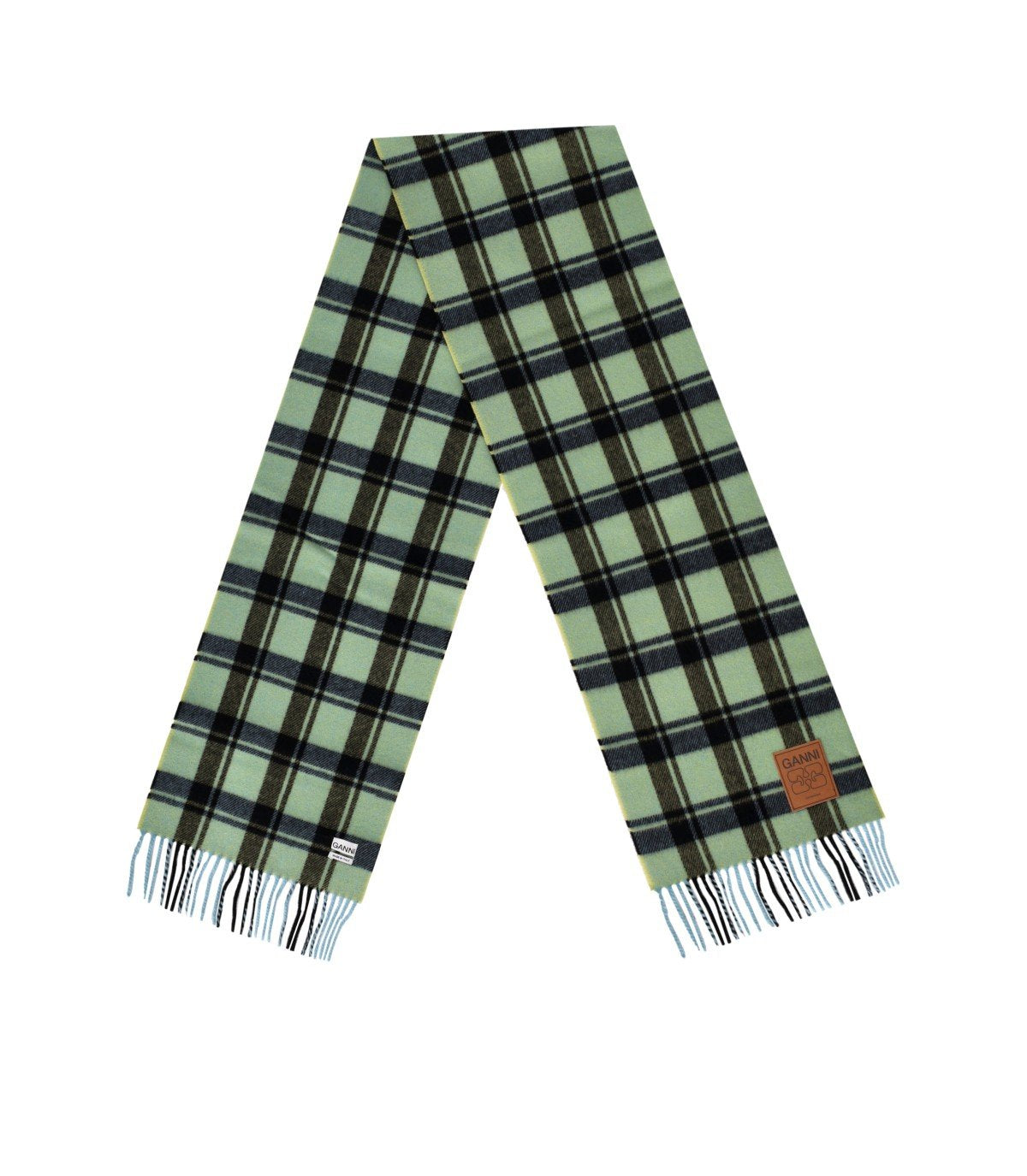 Sciarpa Check di Ganni realizzata in lana con motivo tartan nei toni del verde lime e del nero. Orlo sfrangiato e patch logo a contrasto Misure: 200x30 cm.
