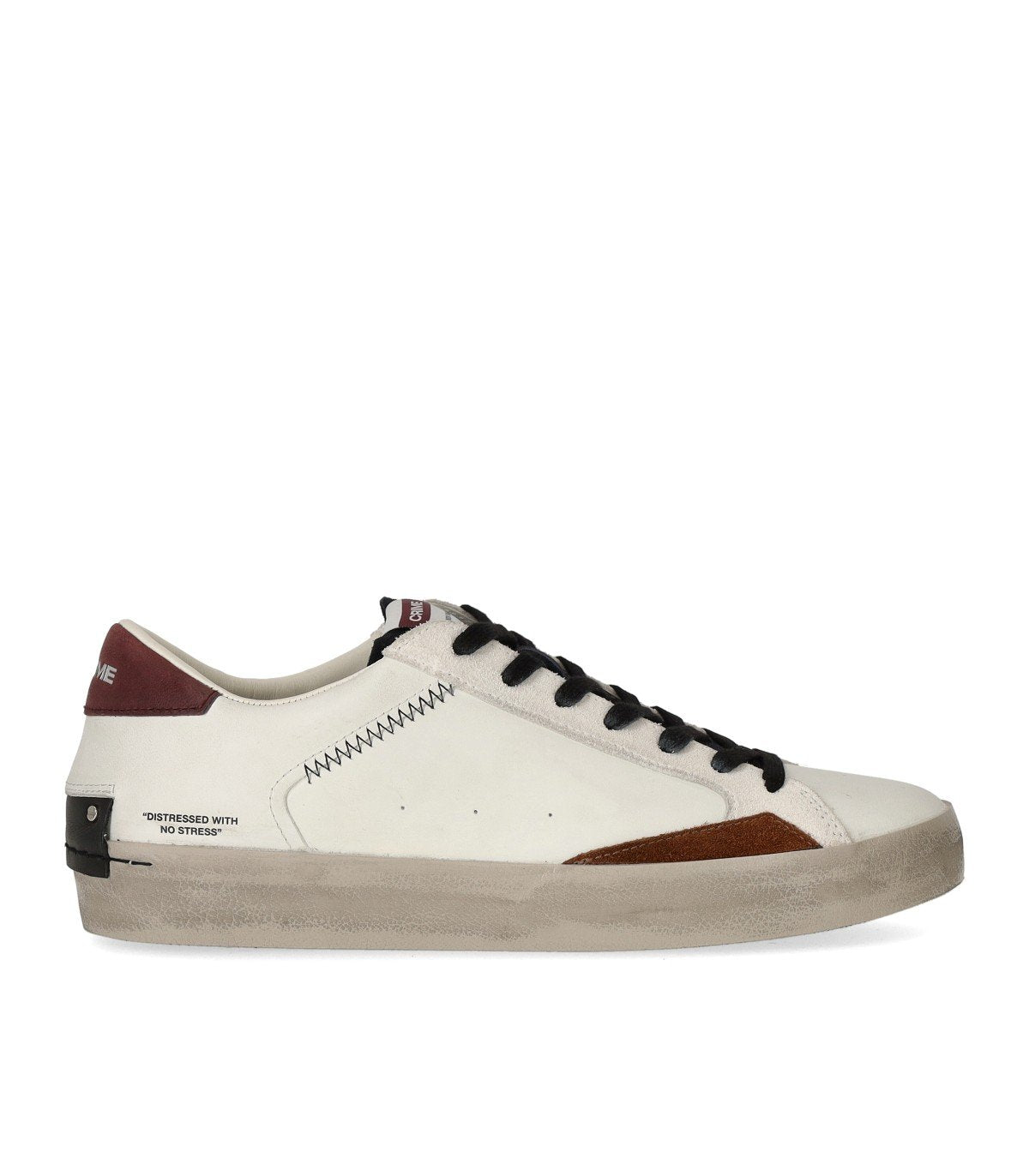 Sneaker Distressed di Crime London realizzata in morbida pelle con inserti in suède nei toni del bianco, del marrone e del bordeaux. Logo inciso sul retro, interno in pelle e spugna di cotone. Soletta estraibile in pelle, suola in gomma. Altezza 3 cm.
