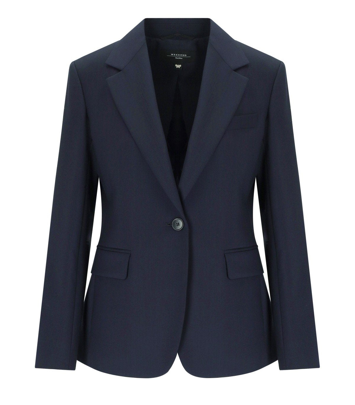 Max Mara Weekend Lamine-blazer, gemaakt van scheerwol in blauwtinten. Met voering; heeft een sluiting aan de voorkant met één knoop, inkepingsrevers en een split achter. Voorzien van opgestikte klepzakken aan de voorkant en een borstzak. Regular fit.