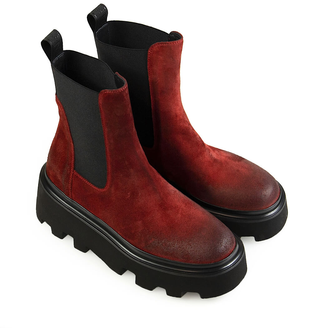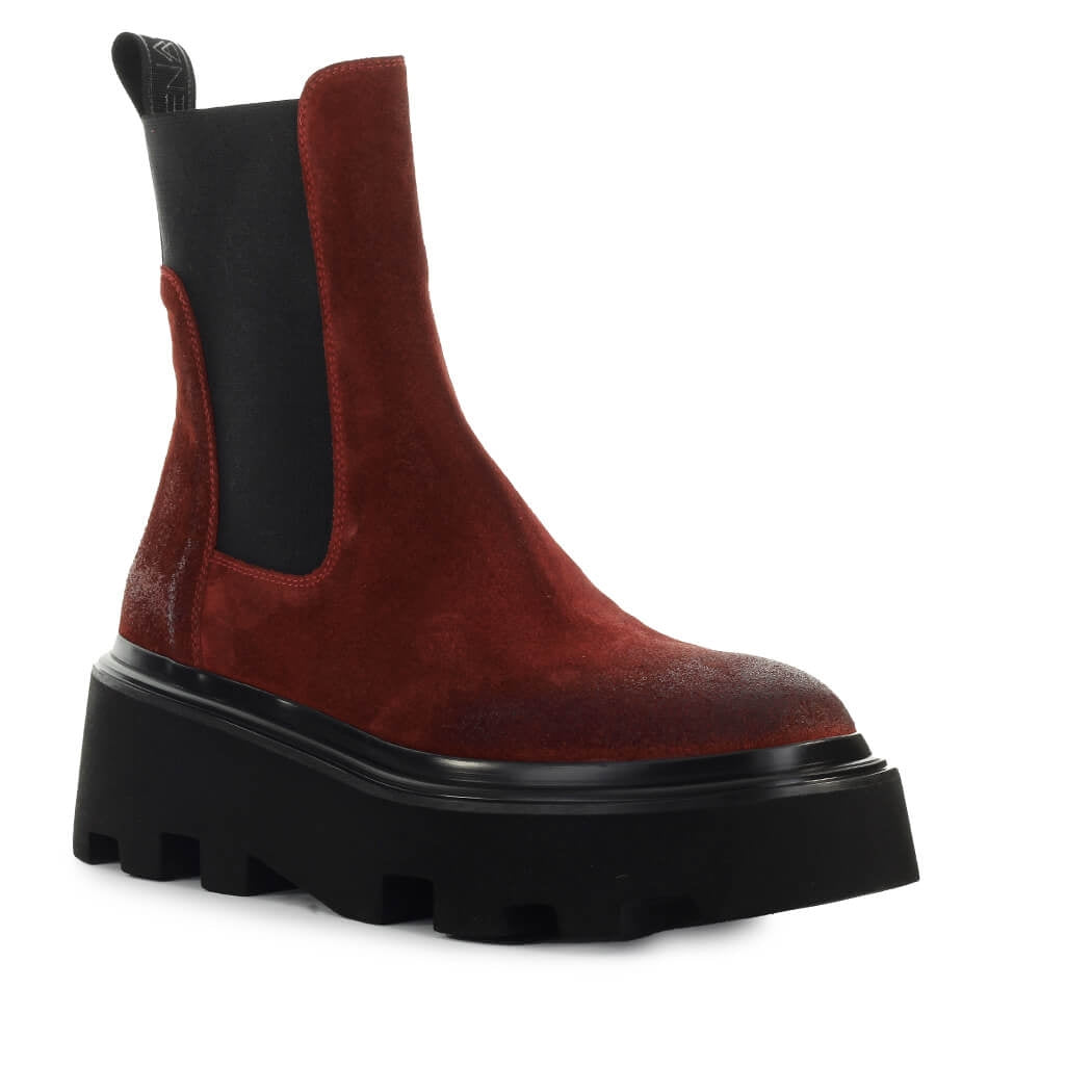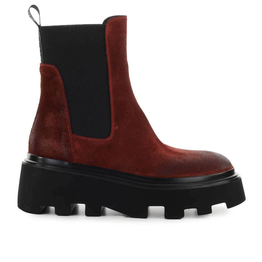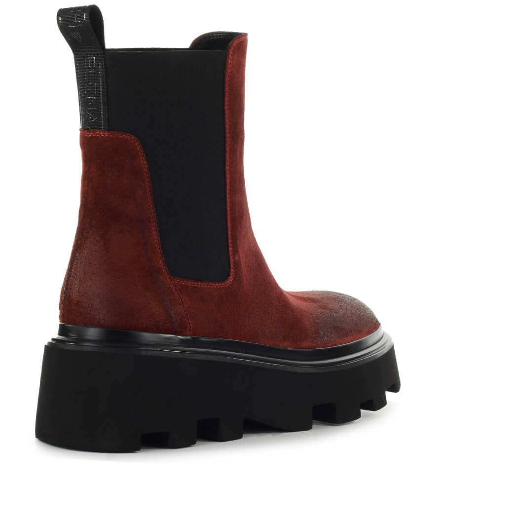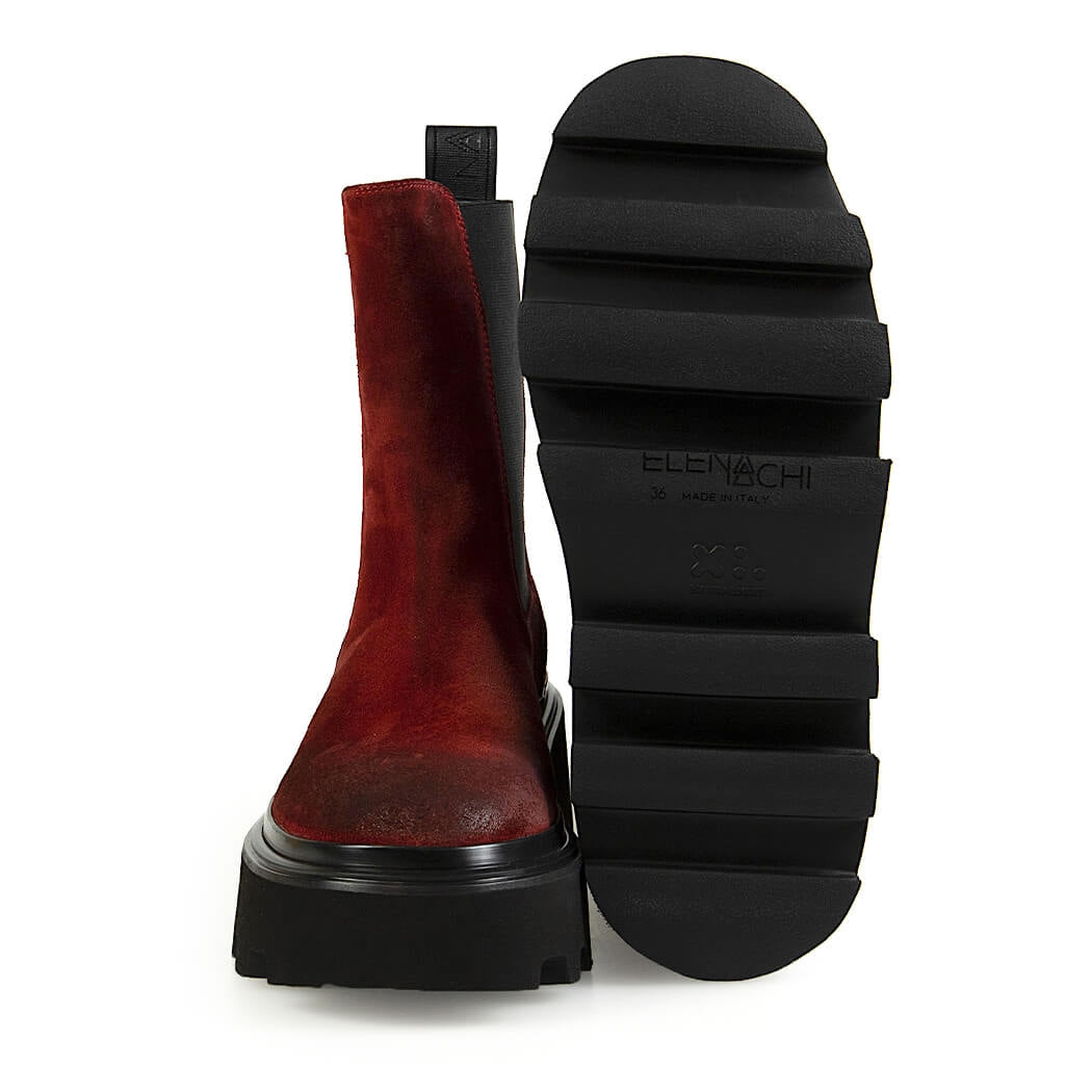 Elena Iachi chelsea laars in rood suède met vintage effect details. Elastische banden aan de zijkanten en achterkant om de pasvorm te vergemakkelijken. Zwarte rubberen zool, hoogte 7 cm.