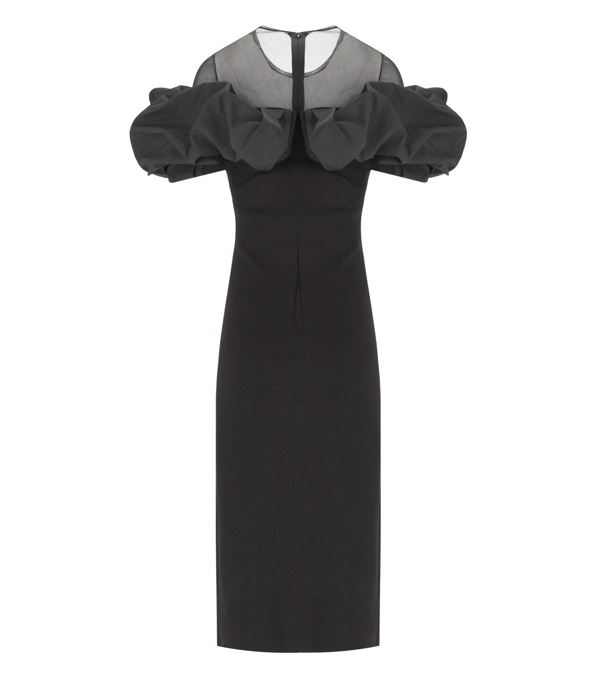 Isatis-jurk van Essentiel Antwerp, vervaardigd uit een geribde viscosemix in zwarte tinten. De jurk is verfraaid met schouders en mouwen van tule, omringd door volumineuze ruches in dezelfde kleur. Voorzien van een ritssluiting aan de achterkant. Nauwsluitend model.