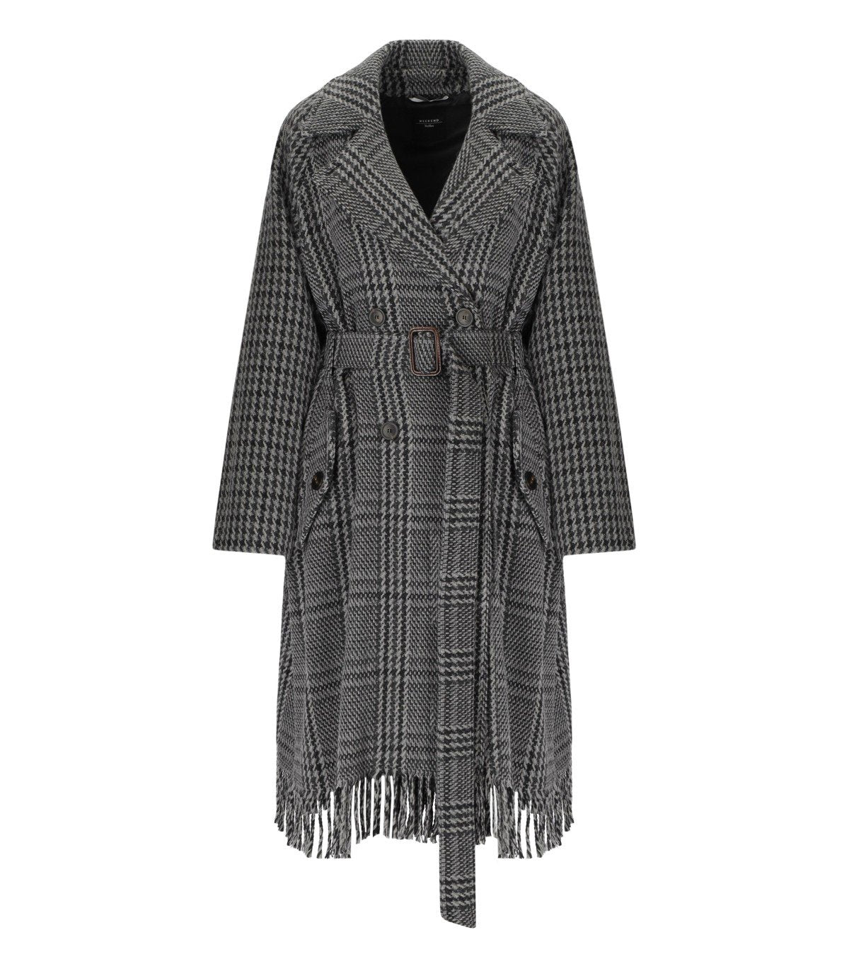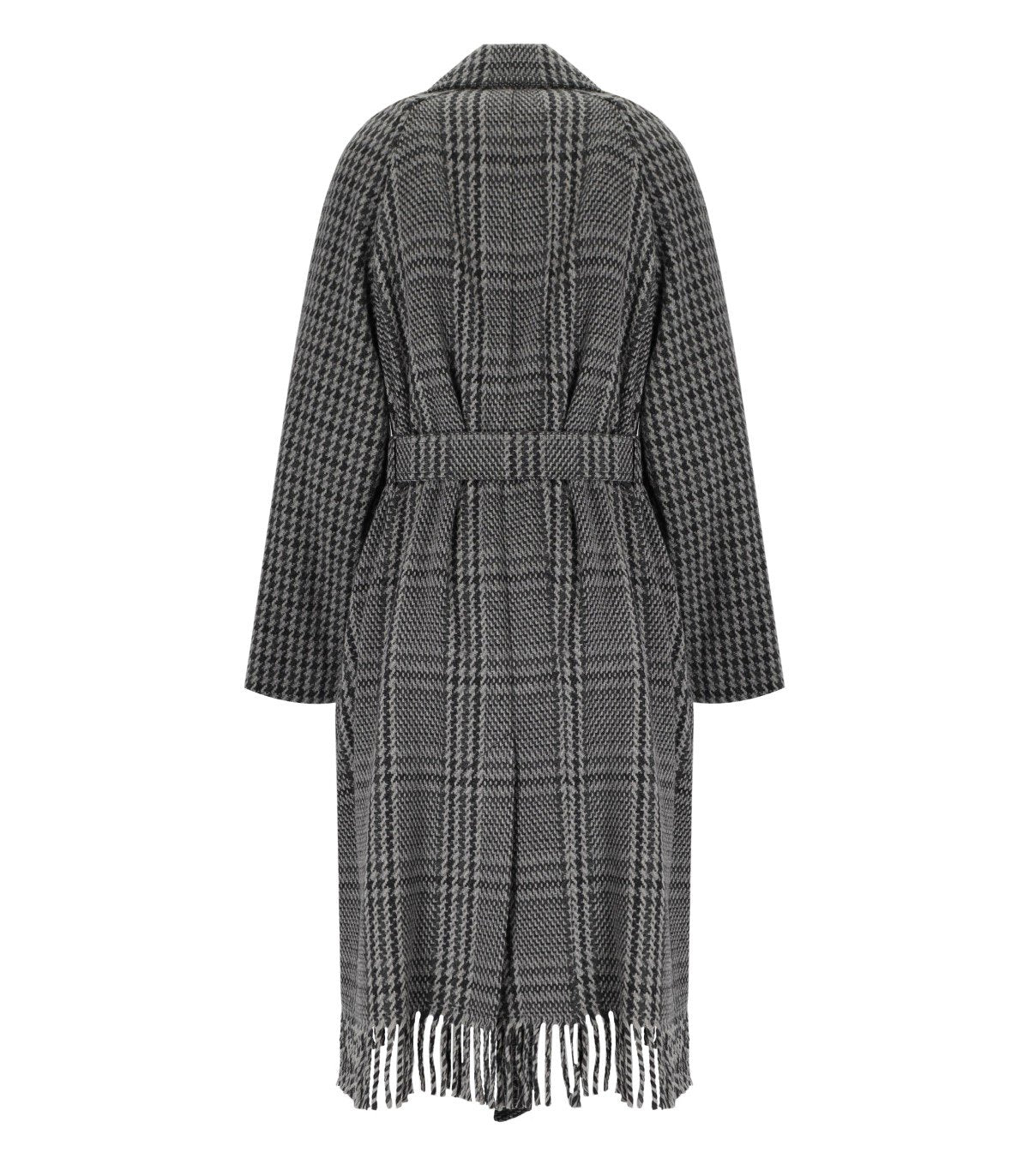 Carpi-jas van Max Mara Weekend, vervaardigd uit een wolmix met een Prince-de-Galles- en pied-de-poule-dessin in grijstinten. Gevoerd aan de binnenkant, met franjes aan de onderkant en klepzakken aan de voorkant. Dubbele knoopsluiting met bijpassende, afneembare ceintuur. Comfortabele pasvorm.