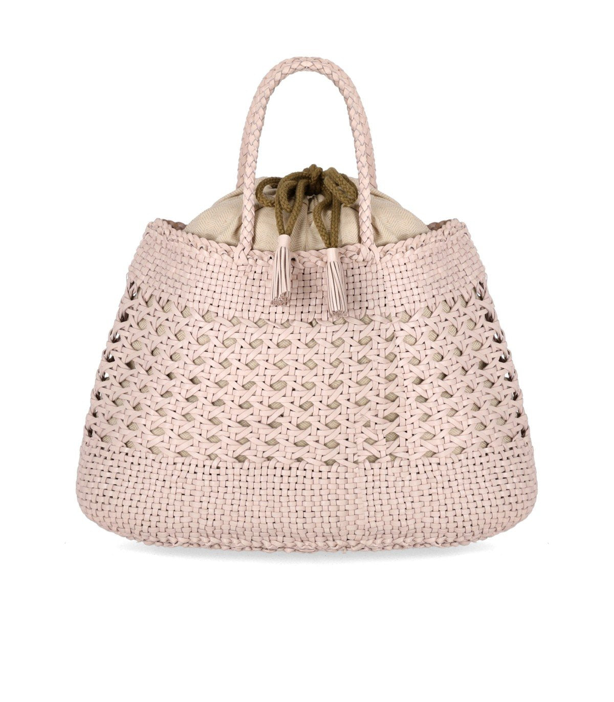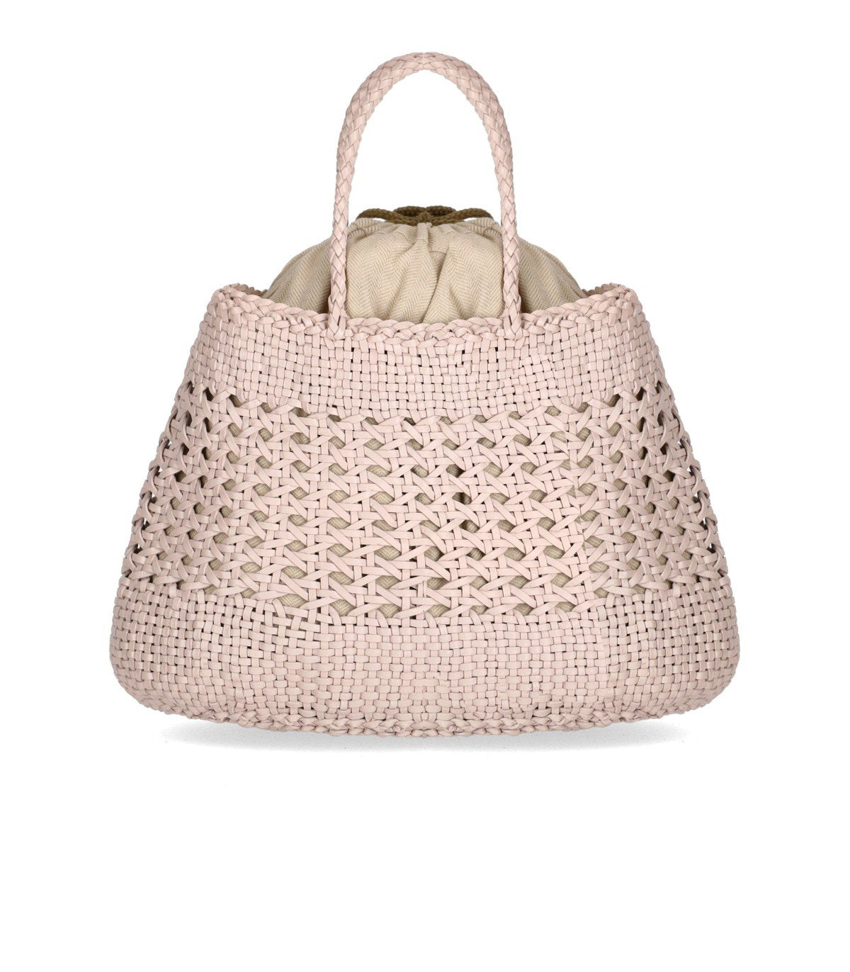 Dragon Diffusion Santa Cano bag made of leather, featuring woven pattern, in blush pink tones. Equipped with double handles and a drawstring closure embellished with tassels at the bottom. Features an internal canvas pouch. Measurements: 30 x 23 x 11 cm.