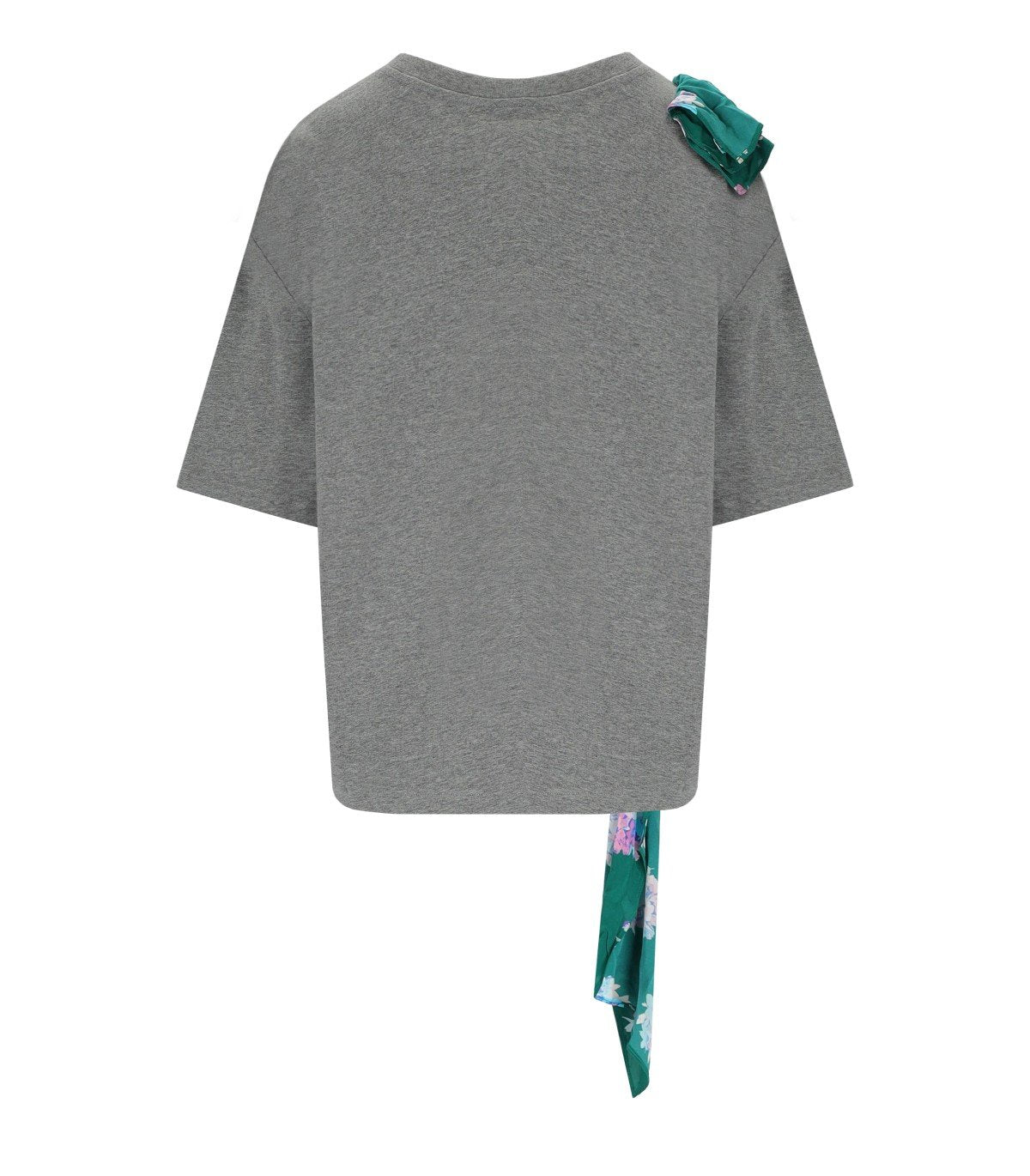 Essentiel Antwerp Jilly T-shirt made from grey mélange cotton, featuring a contrasting maxi front print. Floral ruffle appliqués on the side, oversized fit.