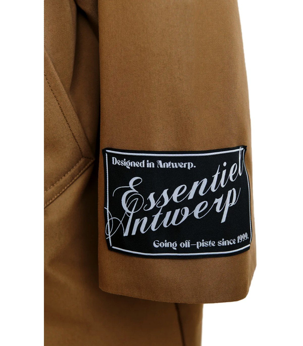 Josje trench coat by Essentiel Antwerp made from a brown cotton-blend fabric. Contrasting quilted lining, oversized logo patch on the sleeve, and double-breasted button closure. Front pockets, oversized fit.
