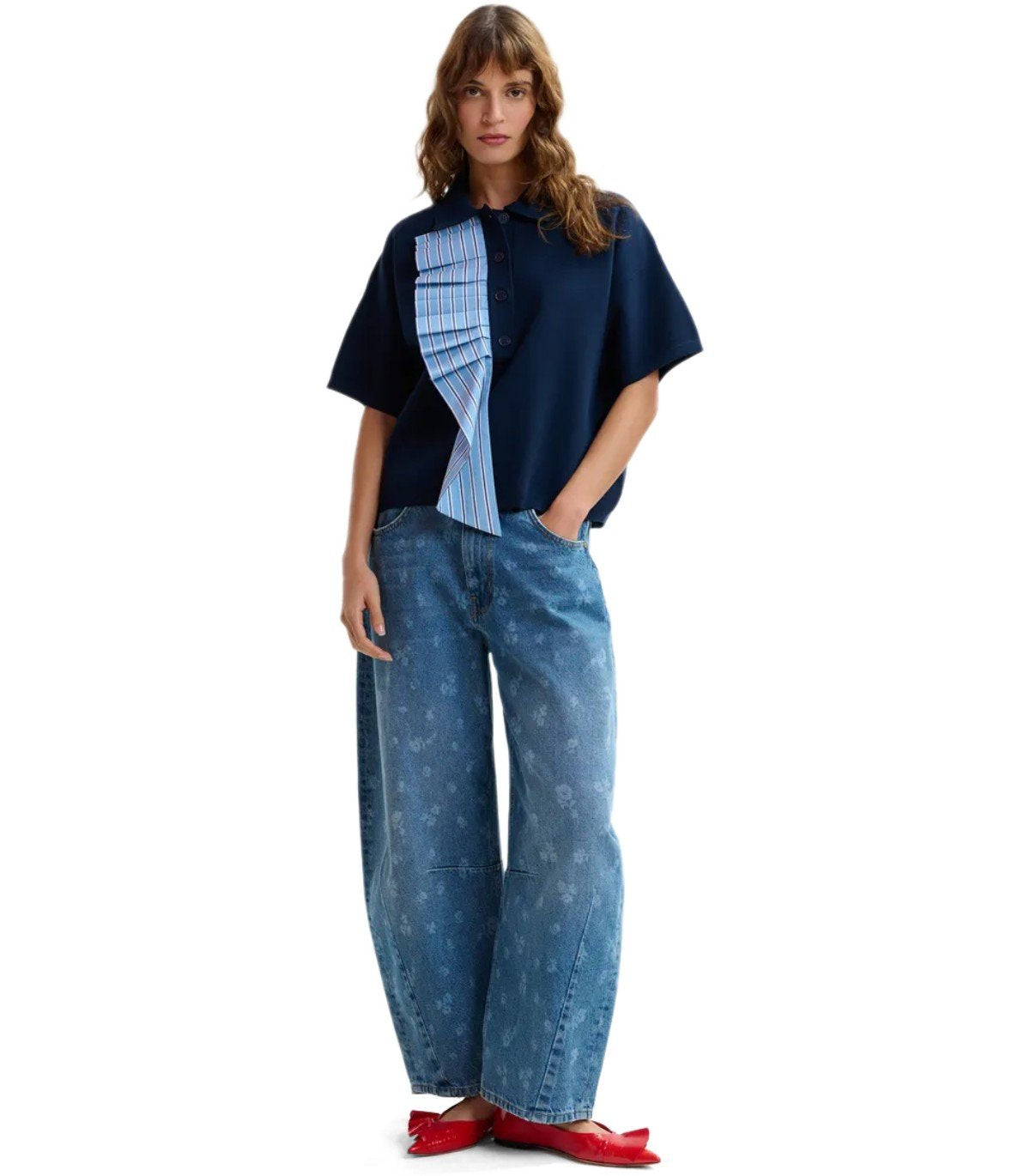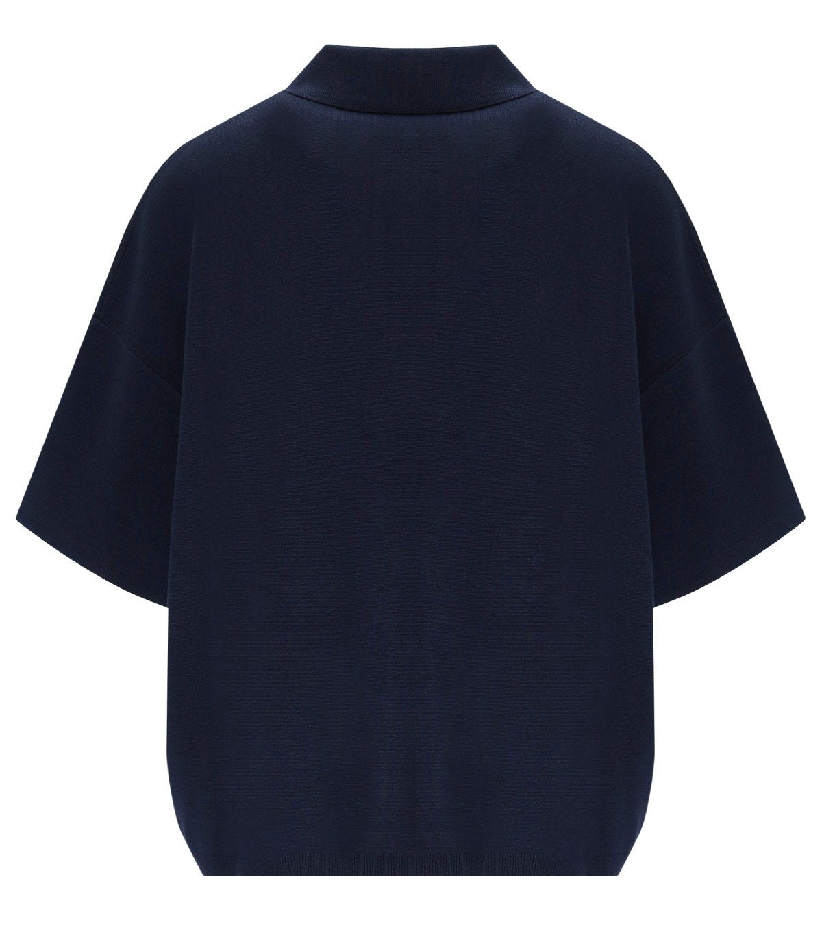 Essentiel Antwerp Jumble polo shirt made from navy blue stretch viscose yarn. Shirt-style cotton poplin ruffle detail on the front, 4-button closure, dropped shoulder and relaxed fit.