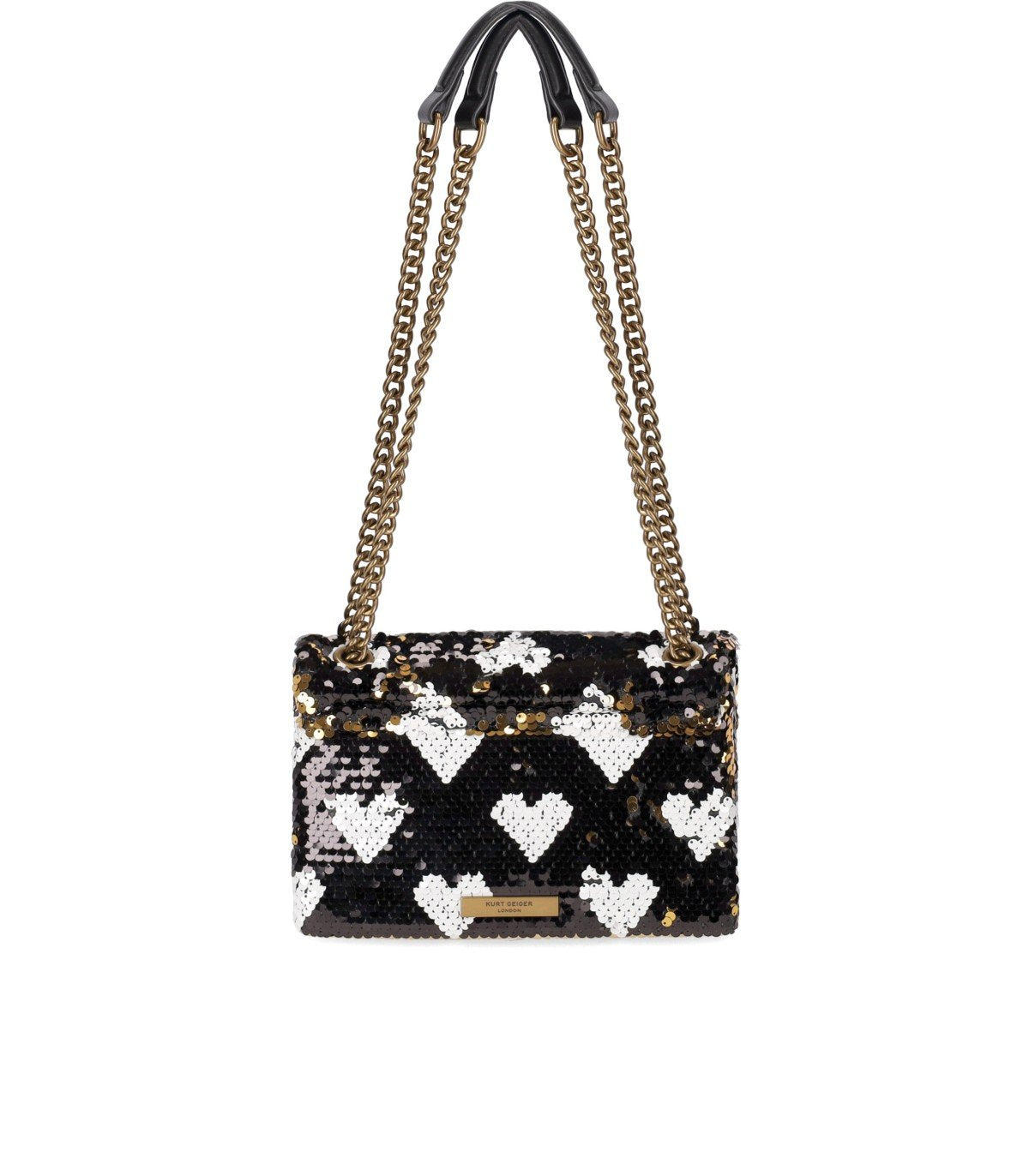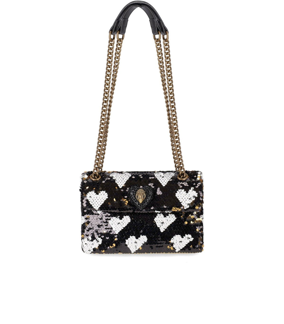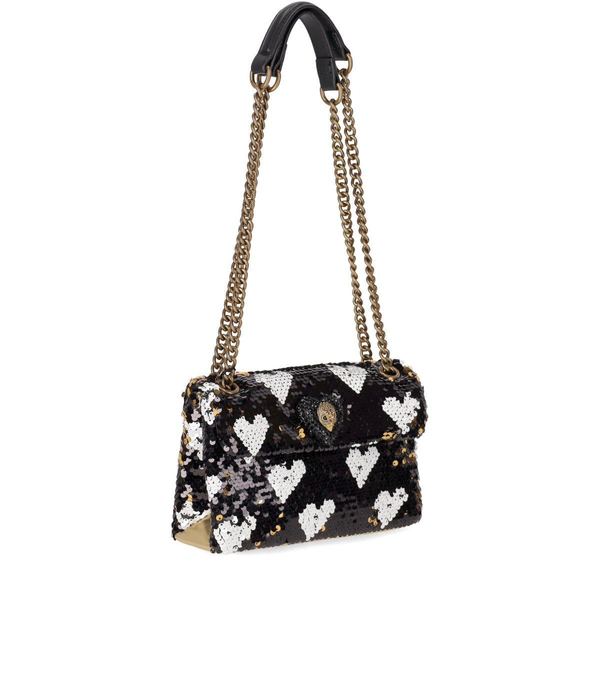Kurt Geiger Kensington Love bag made from bicolor sequin yarn in black and gold tones with a white heart motif. Embellished with a gold-tone base, it features a magnetic closure, a single lined interior compartment, and a card slot. Iconic bird with a heart on the front. Dimensions: 21 x 13 x 7 cm.