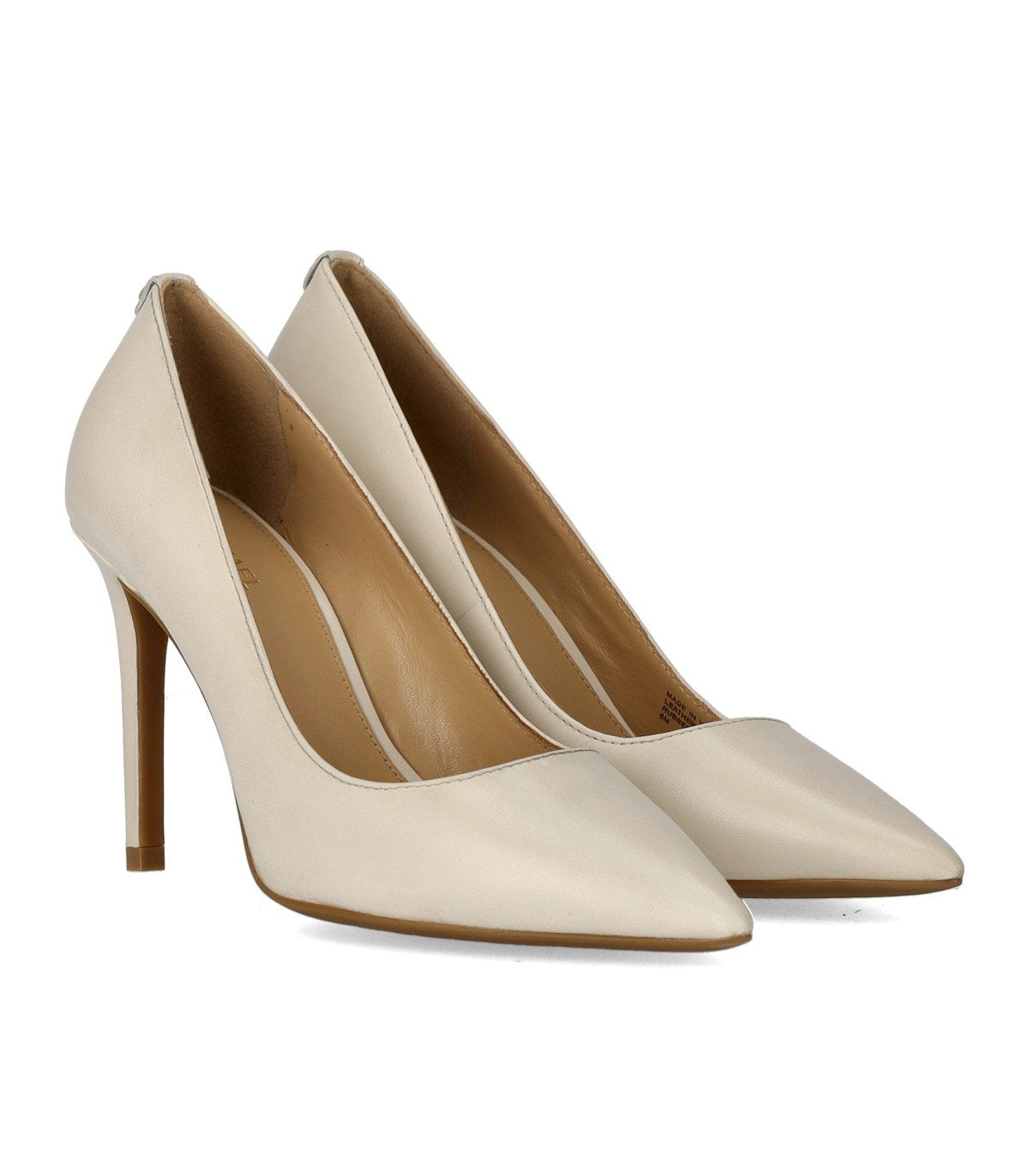 Alina Flex High pump by Michael Kors is made of cream-colored leather. It features a pointed toe, matching leather lining, and a gold MK logo on the back. Rubber sole. Heel height: 9 cm.