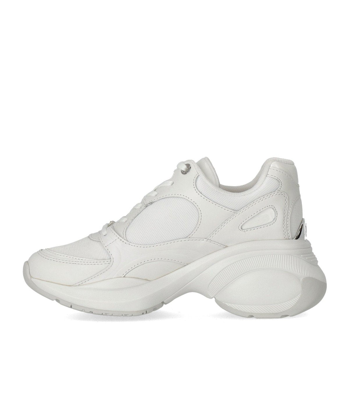 Michael Kors Zuma sneaker made of leather, mesh and patent leather in shades of white. MK logo on the side. Embellished with a silver-tone metal logo detail on the heel. Fabric lining and insole. Maxi rubber sole. Height: 6.5 cm.