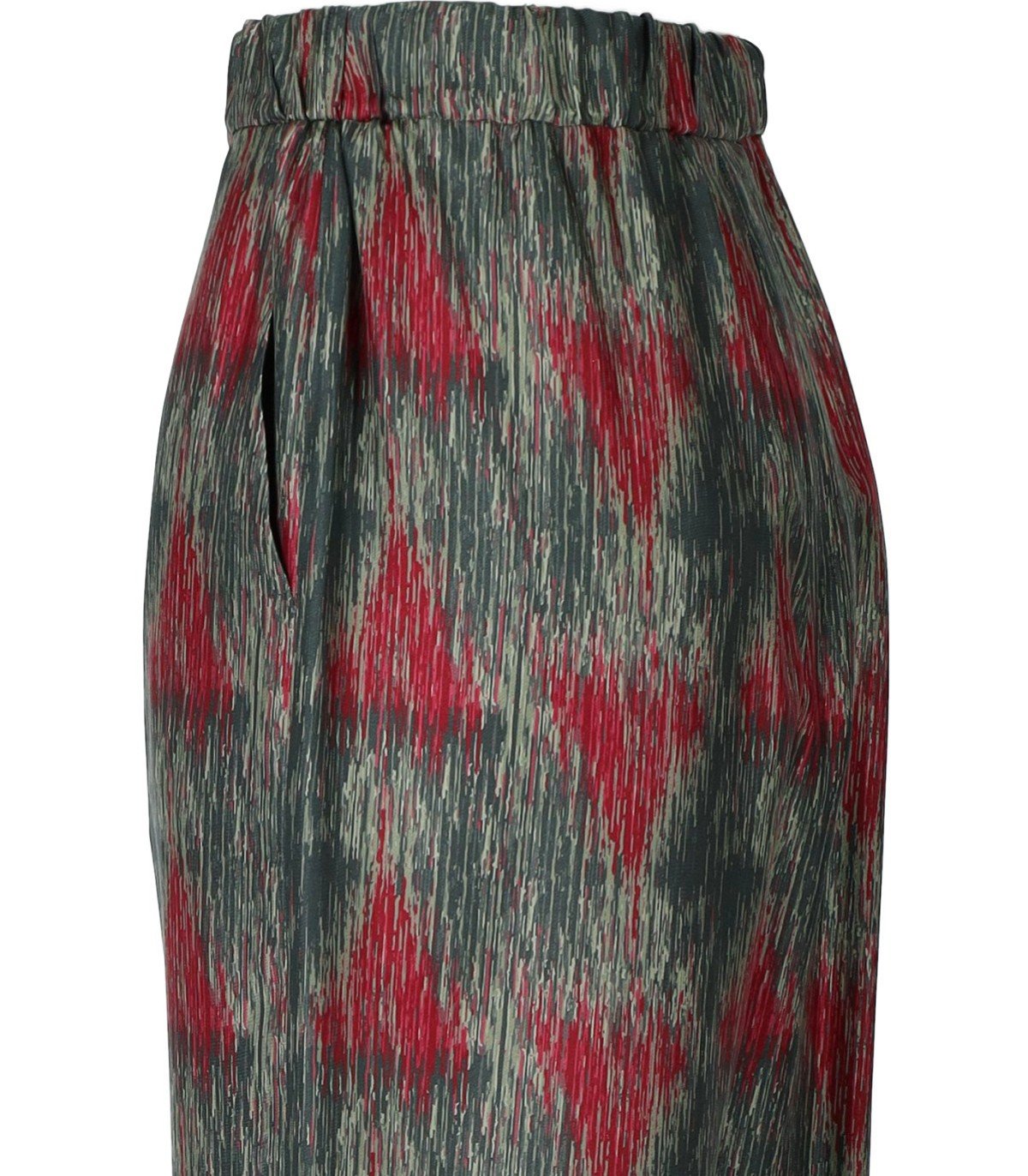MM Max Mara Piovra trousers made of silk with an irregular striped print in various shades of green and red triangles. Features slanted side pockets and an elasticated waistband. Loose fit.